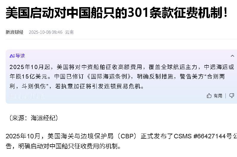 [下雨]事关国运,中国必须打赢这场战争!这是一场关乎中国未来的生存战争。我们退一步,全球供应链就塌;我们让一步,百年海权就断。现在,不是谈条件的时候。 美国最近的新政策针对的不只是贸易本身,而是一场牵动全球经济命脉的较量。2025年10月以后,美国针对中国造船业和航运推出了船舶费用新规,简单概括拉高中国制造的货船停泊费用,让别人不愿意再用中国船只。 政策背后的算盘就是要用高额额外成本把中国的全球贸易优势一点点削掉,让中国的产品没办法顺利送到全世界,这个做法无疑切中了海运是中国经济血管的现实。 美国还联合G7,还通过大公司大资金吃下全球不少重要港口,关键航道两端都逐渐落入美资手中,还设立专门的造船办公室, 到这一步大家应该看明白了,这已经不是普通商业行为,而是一场围绕全球物流主动权的战略大局。 对于中国来说,超过七成的出口和进口全靠大船走海路,一旦被卡住脖子,供应链、产业升级甚至外汇收入都要出问题,这影响的可不仅是某个行业,而是整体经济的安全和增长空间。 美国看似是在针对中国大型船厂,实际上这是让所有中国制造、用中国船的企业都陷入困境,而且美国根本不指望靠本土造船能力翻盘,他们玩的就是盟友、规则、资本和恐惧之间的合纵连横。 一纸新政条文就能让中国的大货轮在全球港口吃闭门羹,带来的直接后果就是大批货物滞留海上,交易延误没完没了,也让中国在全球制造业中的位置充满变数。 中国这些年能成长为世界工厂,靠的不是高空物流,而是无数条航运线路和遍布世界的港口投资。如今新政策只会让中国企业经营成本上涨,外部合作伙伴看到风险可能也会迟疑和观望。 美国一边收紧政策,一边通过收购港口和推动新规则,明显就是要对中国形成包围圈,而面对这种局面,妥协和等待从来解决不了本质问题,越是让步,对方只会得寸进尺。 更何况美国的新流程,“靠港税”只是开头,后头还有一连串保险费、附加费、碳税等着中国企业。 在这关键节点,只能比谁的胆子更大、谁的行动更快。中国有全球最大商船队,全国最顶尖的造船能力,也在全球许多港口有投资布局,这些都是可以反制和调整的底牌。 在美国和盟友收紧船舶政策的同时,中国可以拉拢正在观望的伙伴,比如东南亚或中东国家,联合互惠协议,降低彼此之间的物流和港口成本,稳住货运出路。 还有必要提前布局新航道,例如能极大降低对传统航道依赖的北极航线。对部分走一带一路的沿线港口要加大合作和投入,通过联盟方式增强话语权。 只要中国能根据政策调整优化自己的应对方式,把传统优势转化为细分领域的突破点,那高额关税这些障碍,迟早会被消化掉。 目前美国政策还在不断升级,中国要做的不是守株待兔,而是要和全球企业同步、提前跟进各种合规标准,不给对方找到新借口。 可以通过多边模式和国际规则进行申诉,把中国的合理诉求说到位;同时在国内,可以搭建行业联盟团结应对,及时调整合同、运输线路和保险安排,减少被动损失。 这次面向全球航运新挑战,抓住主动权、用好底牌、及时采取有针对性的措施,才能彻底打破封锁,守住经济生命线,为中国继续保持全球制造大国的地位争取更大空间。