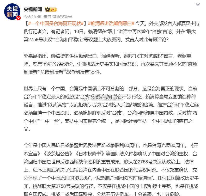 赖清德讲话颠倒黑白 瞅了一眼之前因张雪峰讲支持统一就给张扣帽子“鼓噪战争、古鼓吹战争”的几个账号尤其是大号,他们平时装作非常关注湾湾新闻,也每天每刻混在微博上面,但这条新闻话题一个中国是台海真正现状出来一个多小时了,那几个号装死驴一样不吭声、不参与[怒][怒]