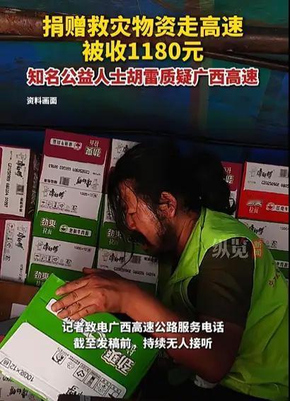 这事看着真让人心里不是滋味。 胡雷给广西灾区捐物资,下高速时被收了1180元。