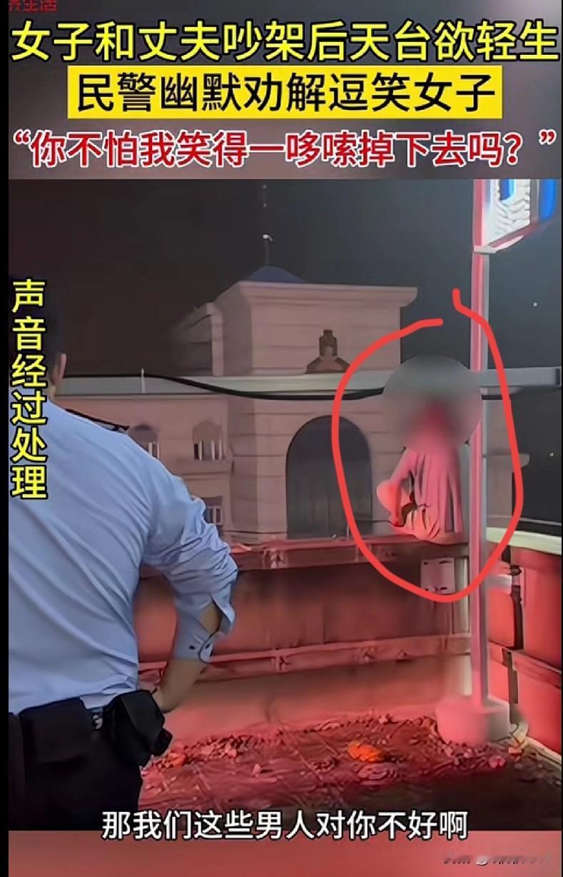 “家人们快看这个民警,劝人都这么有梗!” 一女子和丈夫吵架后跑上天台想不开,