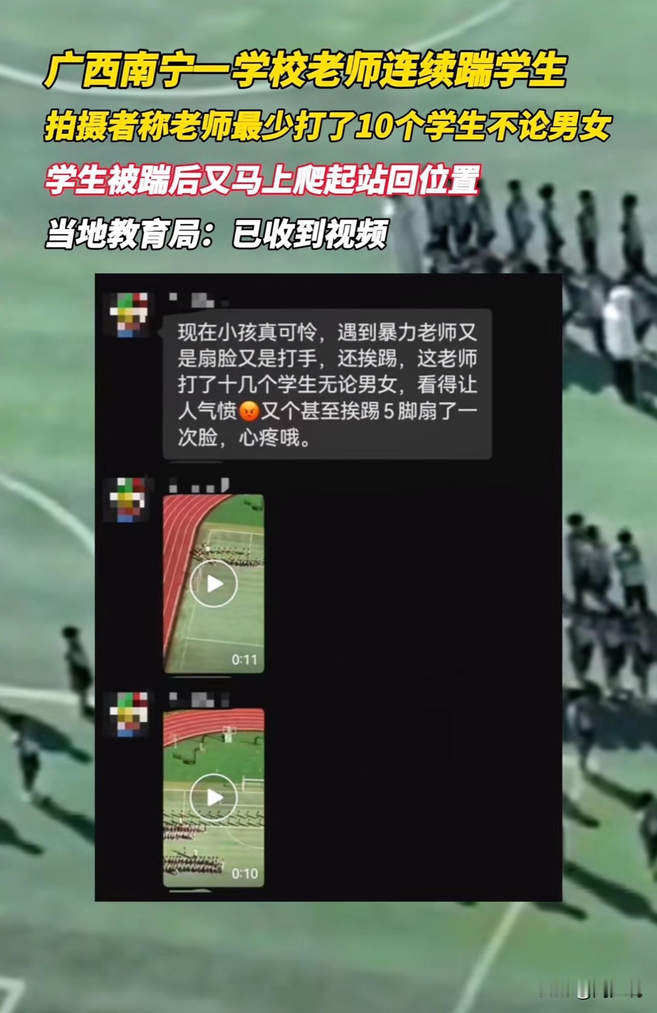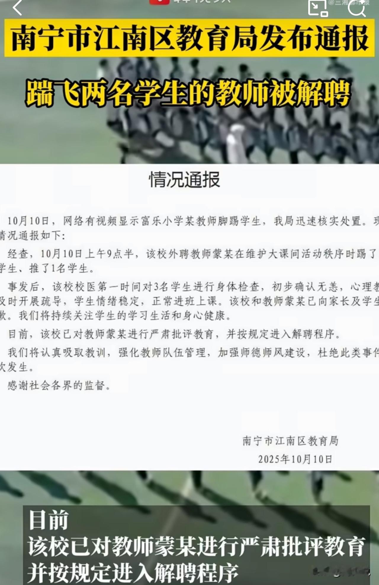 官方通报!广西小学老师踹飞学生,已被解聘! 近日,广西一小学外聘教师蒙某,在大课间维护秩序时踢飞2名学生、推搡1名学生,事件引发关注。 当晚南宁市江南区教育局通报:校医已为3名学生体检,确认身体无碍,心理教师也进行了疏导,学生情绪稳定、正常上课。学校及蒙某已向家长和学生道歉,目前蒙某被严肃批评,正按规定走解聘程序。 针对这位老师的做法,网友热议。有网友当即表示,体罚零容忍!解聘是应有的惩罚,得给孩子一个安全的校园环境。 也有网友说,外聘教师也需严把师德关,不能让冲动行为伤害学生。 这事在周少看来,老师的职责是教孩子对错、护孩子成长,而不是用暴力解决问题。就算是维护秩序,也得有耐心、讲方法,动手只会伤害孩子的心灵,还会让孩子觉得“暴力能解决问题”,这和教育的初衷完全背道而驰。 这次学校快速解聘老师,算是给了家长和学生一个交代,但更该注意的是,不管是外聘老师还是正式老师,都得把“不体罚”刻在心上。学校也要多培训老师怎么正确管理学生,别让冲动毁了孩子,也毁了老师自己。 大家觉得老师遇到调皮学生,该怎么正确管?身边有过好的教育方式吗?#寻美三湘# #长沙新朋友#