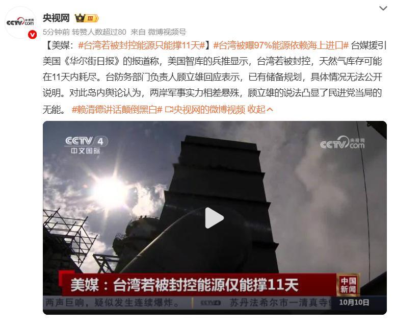 台湾若被封控能源只能撑11天 11天?难道不是围攻当天就给炸掉吗?难道只是围着,让他们在岛内随意吃喝的同时,在国际上蛙蛙乱叫,留下足够的时间让美日欧准备插手吗?[悲伤][怒][怒]