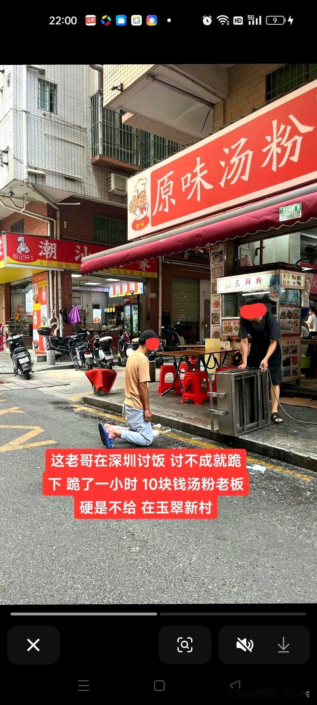 深圳男子竟然下跪讨饭! 今天一位男子路过肠粉店,跟老板说自己三天没吃饭,讨要一份肠粉。 店老板直接严厉拒绝! 该男子竟在肠粉店前下跪不起,一跪就是一个小时。 老板硬是不给。 网友对此表达观点: 几个人在小饭馆吃饭,有个外地口音三十左右胡子垃塌的男子过来乞讨,声称给二十元吃饭,功德无量。一个人看着可怜,正掏钱,另一个说,叫老板过来,煮碗面条给他吃,不要给钱。于是喊老板,这男子又啰嗦几句,见老板过来,转身走了。成年男人,好手好脚,不去打工跑腿赚点钱,沿街乞讨,实在不该给钱。 如果我在肠,请他吃两份,应该是太饿了吧,这老板也太不近人情了 这老板没有怜悯之心,一份肠粉直不了多少钱,如果这男人真是饿了给他一份肠粉,是为自己积福,这店生意好怢做不了多久,人在做,天在看。 九几年深圳报纸上天天讲,深圳不相信眼泪,后来人手不够了须要卖房子,又说来了就是深圳人。如是又有闲才整理出深圳一百爱,深圳一百恨。