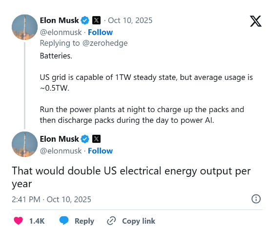 近日,马斯克在社交平台X上表示,美国电网具备约1万亿瓦稳定输出能力,但日均使用量仅为0.5万亿瓦。通过夜间运行发电厂为电池组充电,白天释放电力支持AI运算,将可以"使美国的年发电量翻倍"。他称大规模工业级电池是稳定电网的制胜方案。