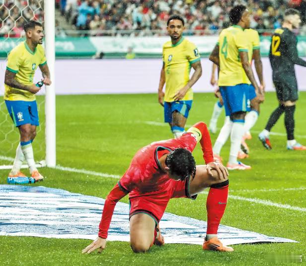 韩国0比5巴西 韩国《朝鲜日报》在总结分析这场比赛的时候,选择了这样一张配图,隐含的意思很明确了,孙兴慜独木难支,带不动这支韩国队了。