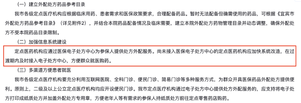 9月28日宜宾市医保局官网发布《关于规范医保药品外配处方管理的通知》(以下简称《通知》),督促定点零售药店加快系统改造、提升服务能力,主动承接并规范管理外流处方。