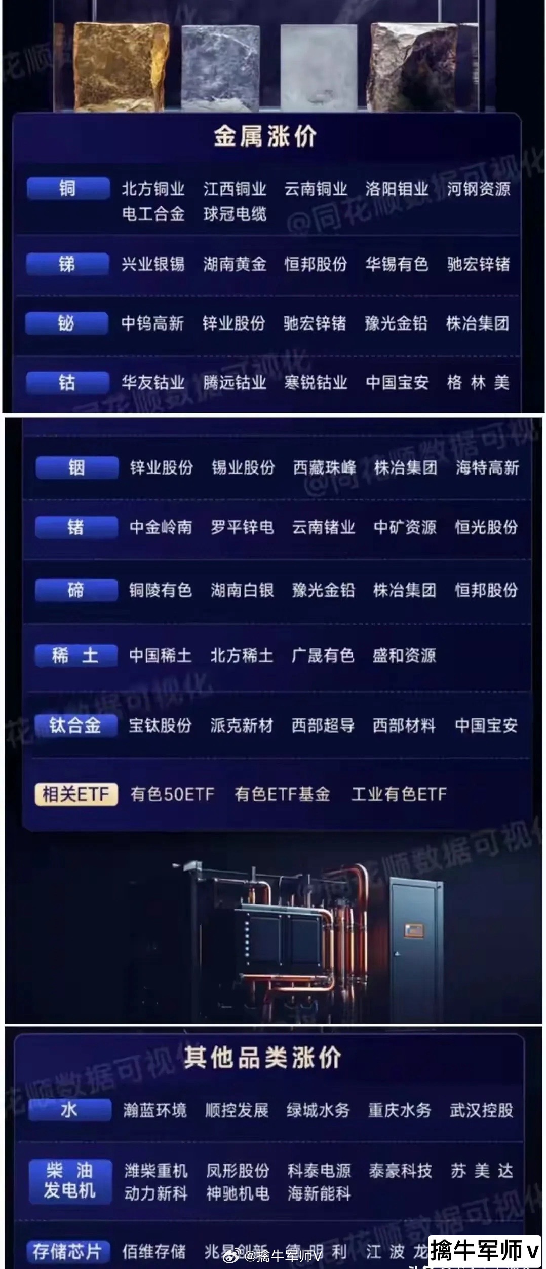 - 金属涨价:包括铜(如北方铜业、江西铜业)、锑、铋、钴等,同时列出了相关ETF(如有色50ETF、有色ETF基金、工业有色ETF),反映有色金属作为基础工业原料,在经济复苏周期中的涨价预期和资金关注度。