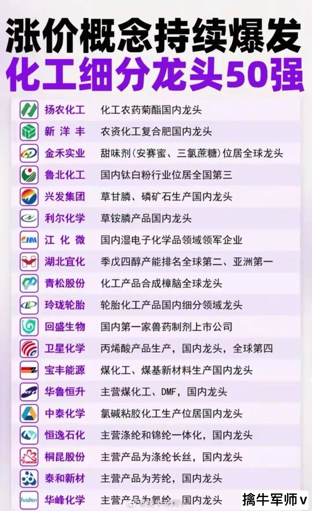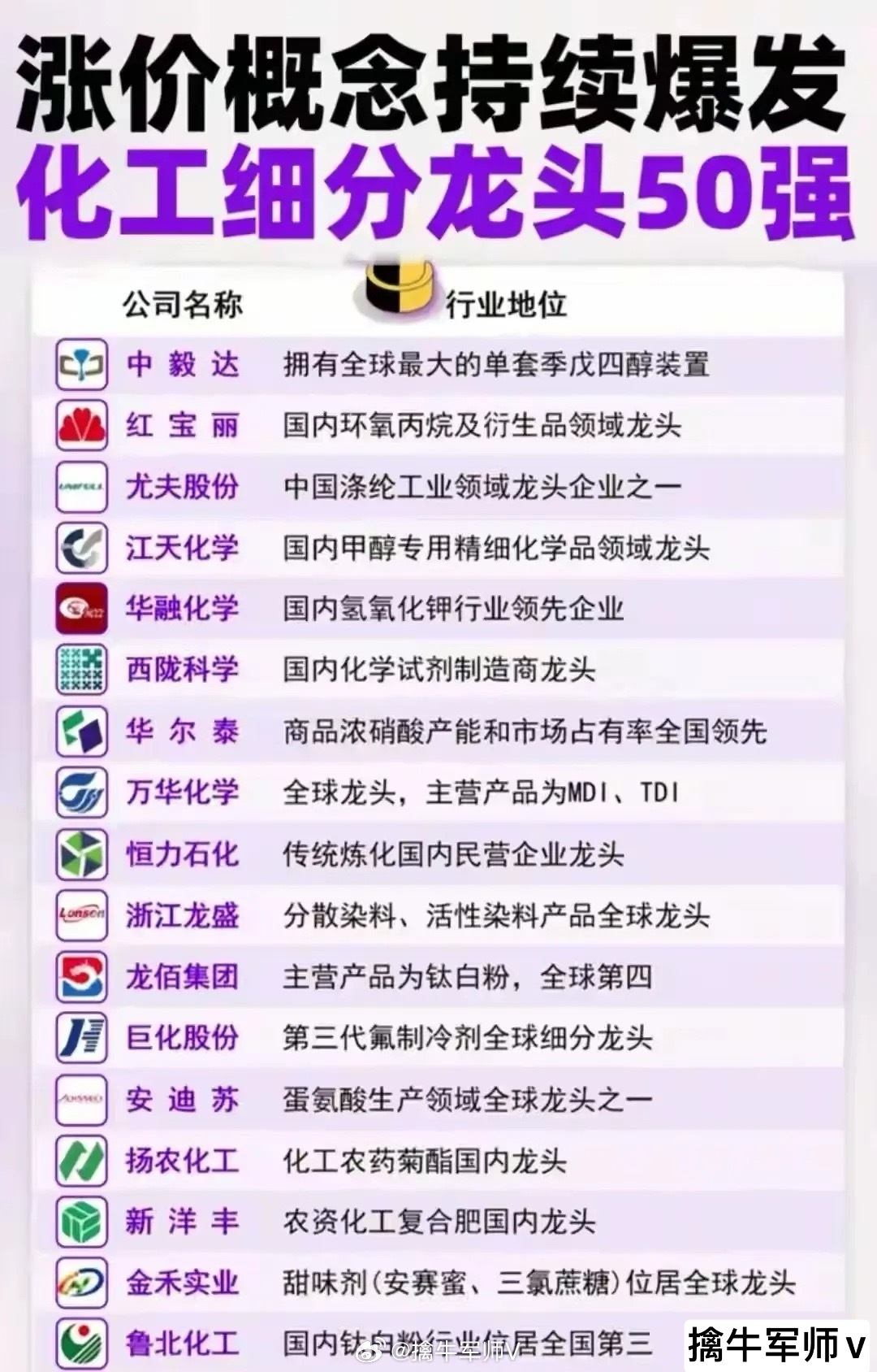 “涨价概念”,聚焦于化工及部分金属、大宗商品领域,集中展示了当前市场上因供需变化或经济复苏预期而出现价格上行的细分行业及其代表性龙头企业。