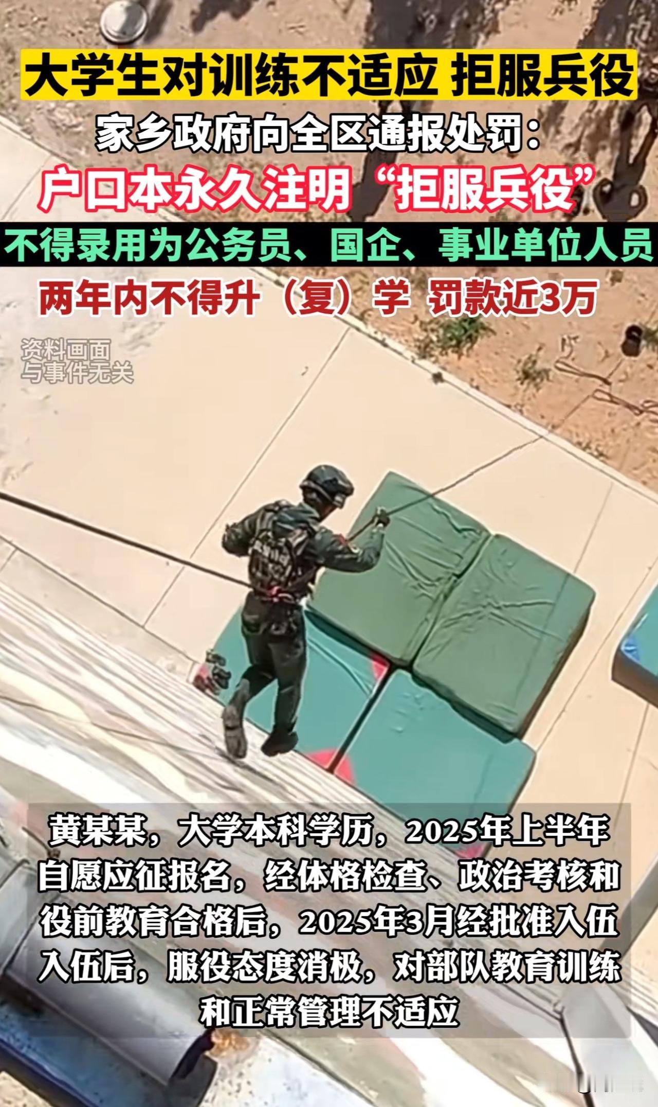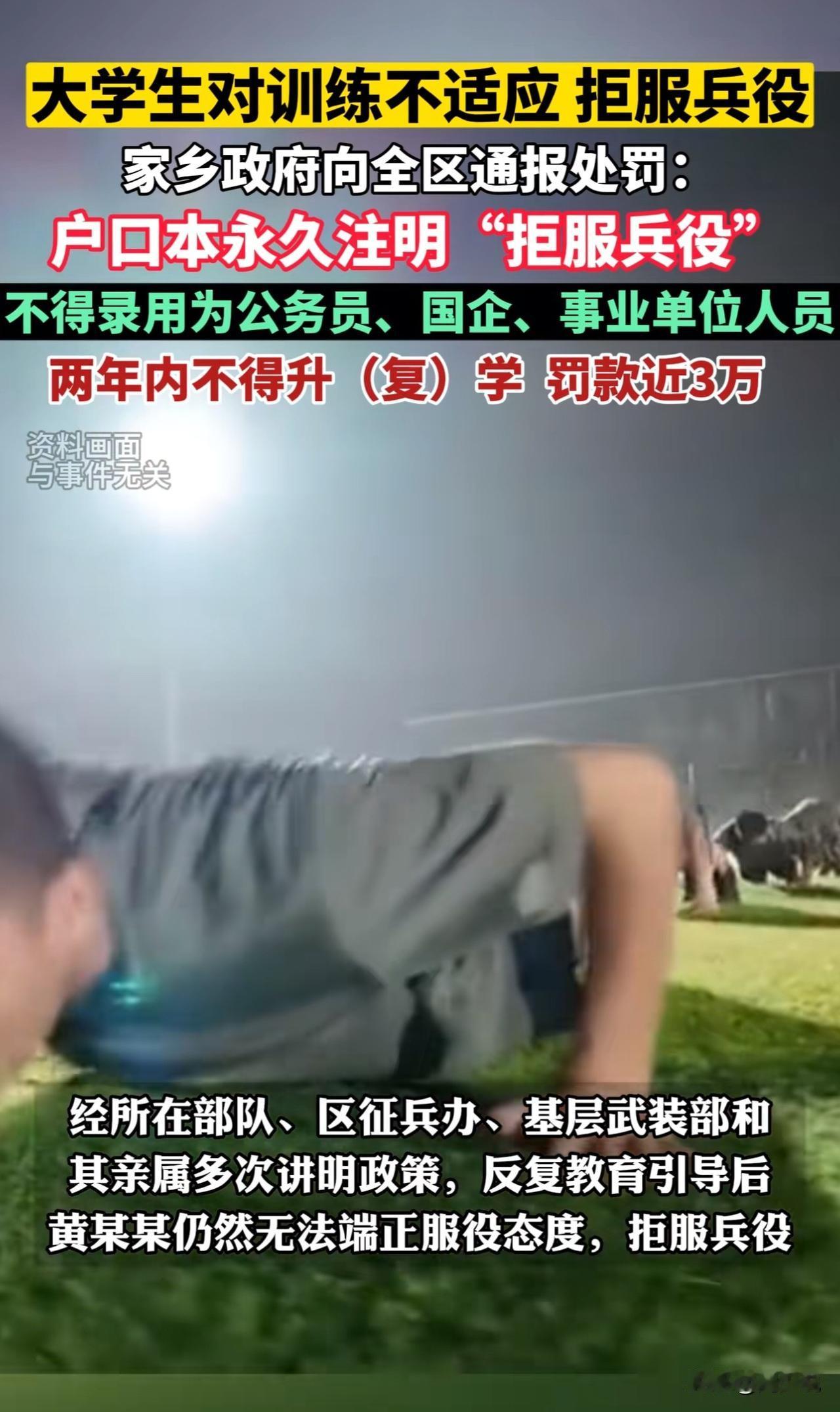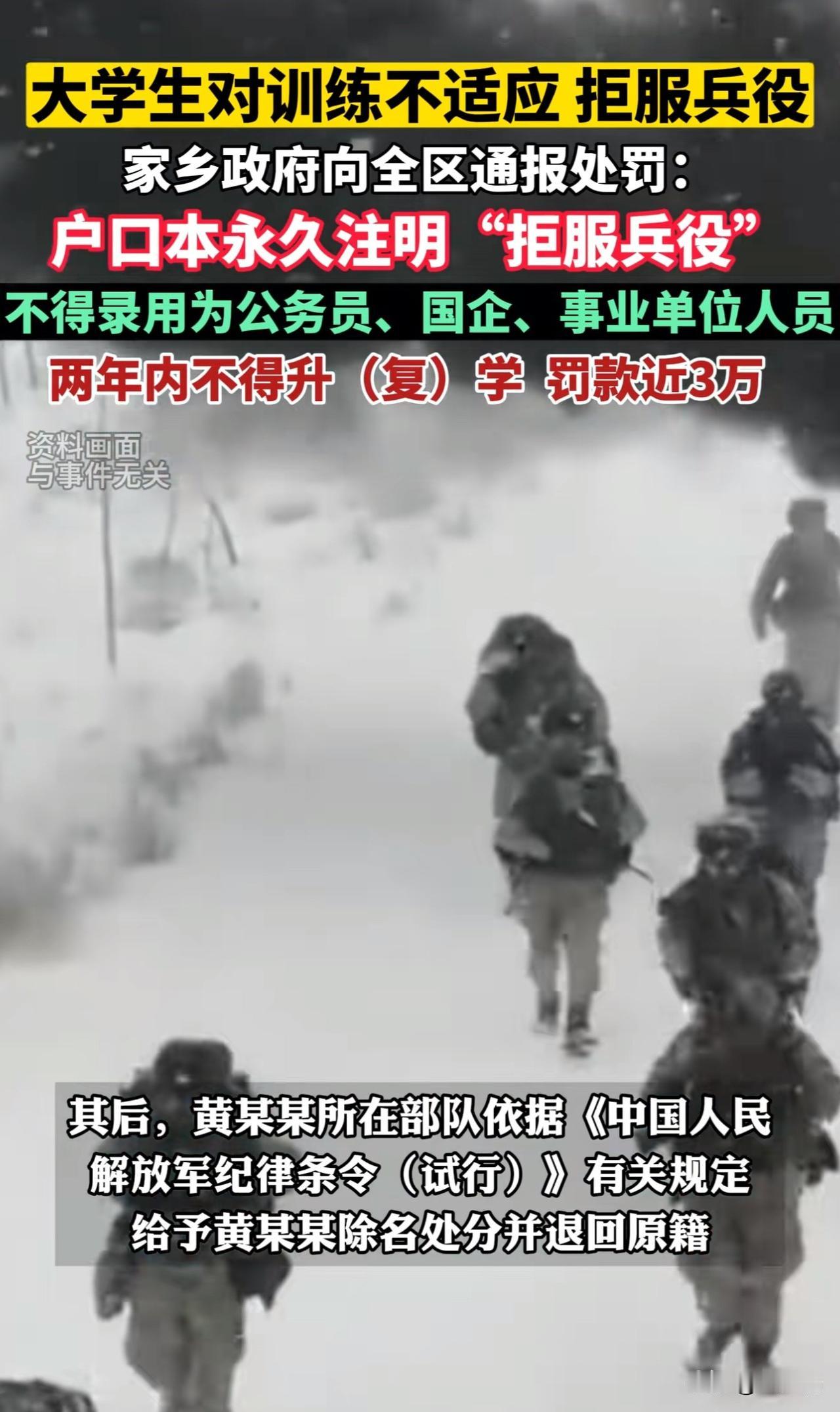 拒服兵役后果严重!大学生黄某某被永久标注加罚款近3万! 近日,广东肇庆鼎湖区征兵办通报:黄某某入伍后,服役态度消极,对部队教育训练和正常管理不适应,拒服兵役,被撤销本人及家庭义务兵优待,并按2025年义务兵家庭优待金(14968元)2倍标准罚款29936元。同时,户口本永久注明“拒服兵役”,不得录用为公务员、国企、事业单位人员,两年内不得升(复)学,两年内不得办理出国(境)手续。 对于这则通报,众多网友纷纷表示,依法服兵役是公民义务,拒绝就该承担法律后果!而且,永久标注会影响个人信用和社会评价,年轻人千万别拿前途开玩笑。 客观的说,周少觉得这个通报处罚一点都不冤,入伍后,服役态度消极,对部队教育训练和正常管理不适应,这真怨不得别人。只能说,自己的一时任性,造就了今天的结果。 当然,这事也给所有大学生提醒,选择参军入伍前,一定要考虑清楚,别等入伍后再反悔,那就真没有后悔的余地了。 大家觉得这样的处罚力度合适吗?如果身边有人拒服兵役,你会怎么劝导?#寻美三湘# #长沙新朋友#