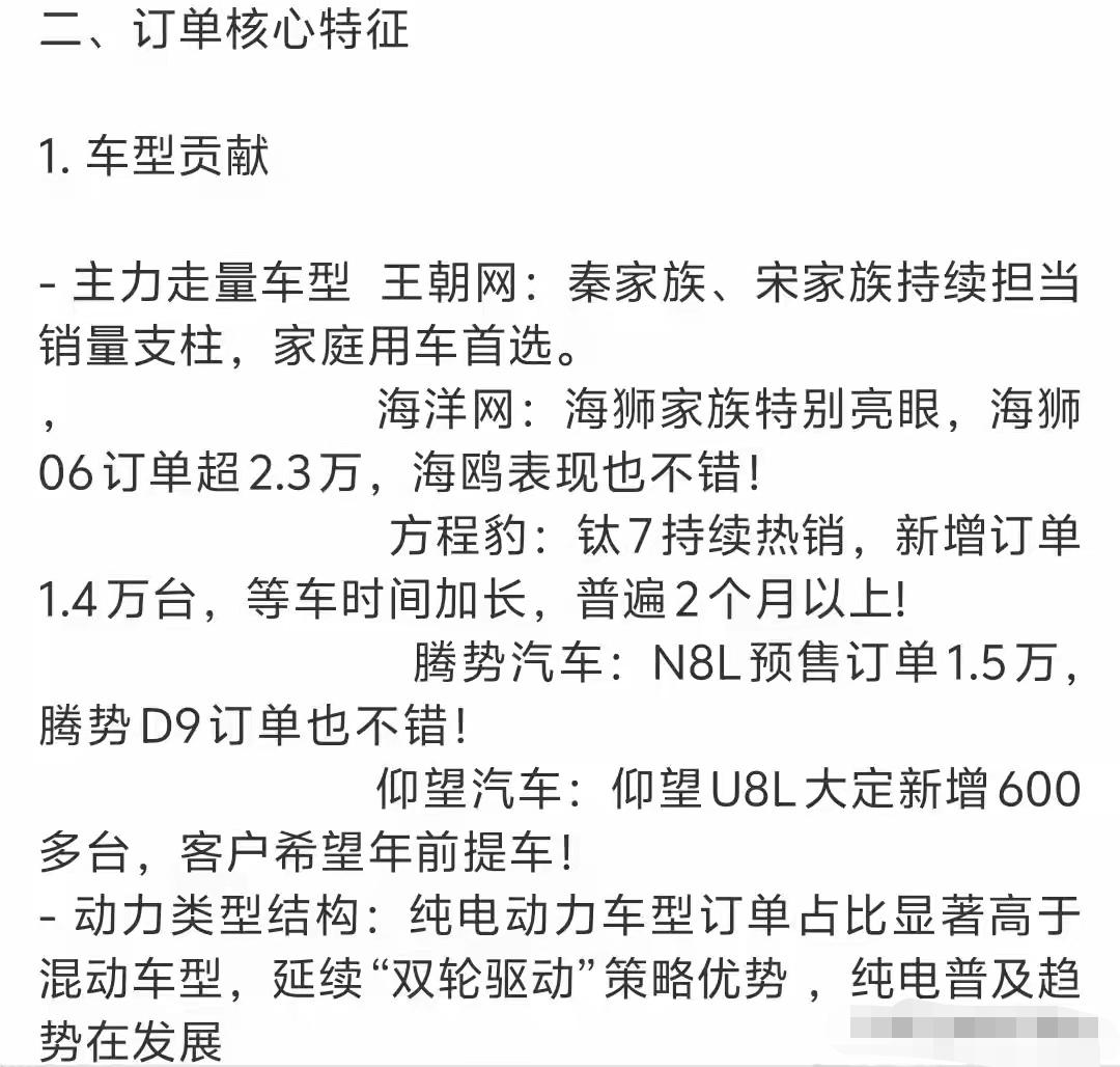比亚迪这波属实杀疯了!国庆假期10月1日 - 10月6日,新增订单超23.6万台,日均约3.65万台。海狮06和钛7表现尤为突出,海狮06订单超2.3万台,钛7新增订单1.4万台。海狮06连续两个月畅销3万多台,9月最后一周单周就拿下1万辆。按这趋势,10月销量至少5万台,稳坐海洋网扛把子。它外观符合年轻家庭审美,灯似双眼皮,车机好用价格还亲民。而钛7走硬派风格,吸引追求个性的年轻人。比亚迪找准了不同消费群体的需求,新车必火或许真会成为趋势。 比亚迪找到感觉了:新车必火已成行业新趋势 国庆假期23.6万台的新增订单,让比亚迪再次刷新市场认知。其中海狮06单车型订单超2.3万台,方程豹钛7新增订单1.4万台且等车周期延长至2个月以上,两款车型的爆发式增长并非偶然,而是比亚迪技术积淀与市场洞察共同作用的必然结果,更预示着其“新车必火”已从现象升级为行业趋势。 精准的市场定位是新车引爆市场的核心密码。海狮06以15万左右的价格锚定年轻家庭用户,在空间、续航与成本间找到完美平衡,单周销量稳定在7000辆左右,9月更是助力海狮系列斩获54065辆销量,同比增幅高达363%。而钛7则聚焦高端户外需求,用硬核越野属性精准击中“方盒子”造型爱好者的痛点,上市三周即售8128辆,成功带动豹5、豹8等同门车型销量攀升。这种“全域覆盖、精准卡位”的布局,既避免了内部竞争,又形成了对细分市场的全面渗透。 技术下放与快速迭代构建起产品护城河。海狮06全系标配曾用于高端车型的云辇-C系统,让普通消费者以亲民价格享受到高端配置;钛7搭载的第五代DM混动技术,更是比亚迪多年技术积累的集中体现。从概念到量产的周期大幅缩短,使得比亚迪能快速响应市场变化,2025年更是计划推出秦L EV、唐L、汉L等十余款重磅车型,覆盖从7.98万元的经济型车到百万级豪华车的全价格带[__LINK_ICON]。这种“技术平权”策略,让每款新车都具备了差异化竞争优势。 品牌力升级与全球布局则为趋势延续提供支撑。汉家族五年收获超百万车主,远销44个国家和地区,证明比亚迪已在中高端市场站稳脚跟。从曼谷街头市占率46%的Atto3,到慕尼黑车展上引发热议的“整车智能”概念,比亚迪正以技术实力改写全球对中国汽车的认知[__LINK_ICON]。这种品牌认可度的提升,让新车自带流量光环,降低了市场教育成本。 尽管9月比亚迪单月销量同比略有下滑,但1-9月326万辆的累计销量仍保持18.64%的同比增长。海狮06与钛7的热销验证了其产品策略的正确性,而即将推出的海豹05、钛3、仰望U7等新车,同样具备成为爆款的潜质。当技术储备、市场洞察与品牌影响力形成合力,比亚迪“新车必火”的趋势已清晰可见,更标志着中国新能源汽车产业进入了以技术引领市场的全新阶段。