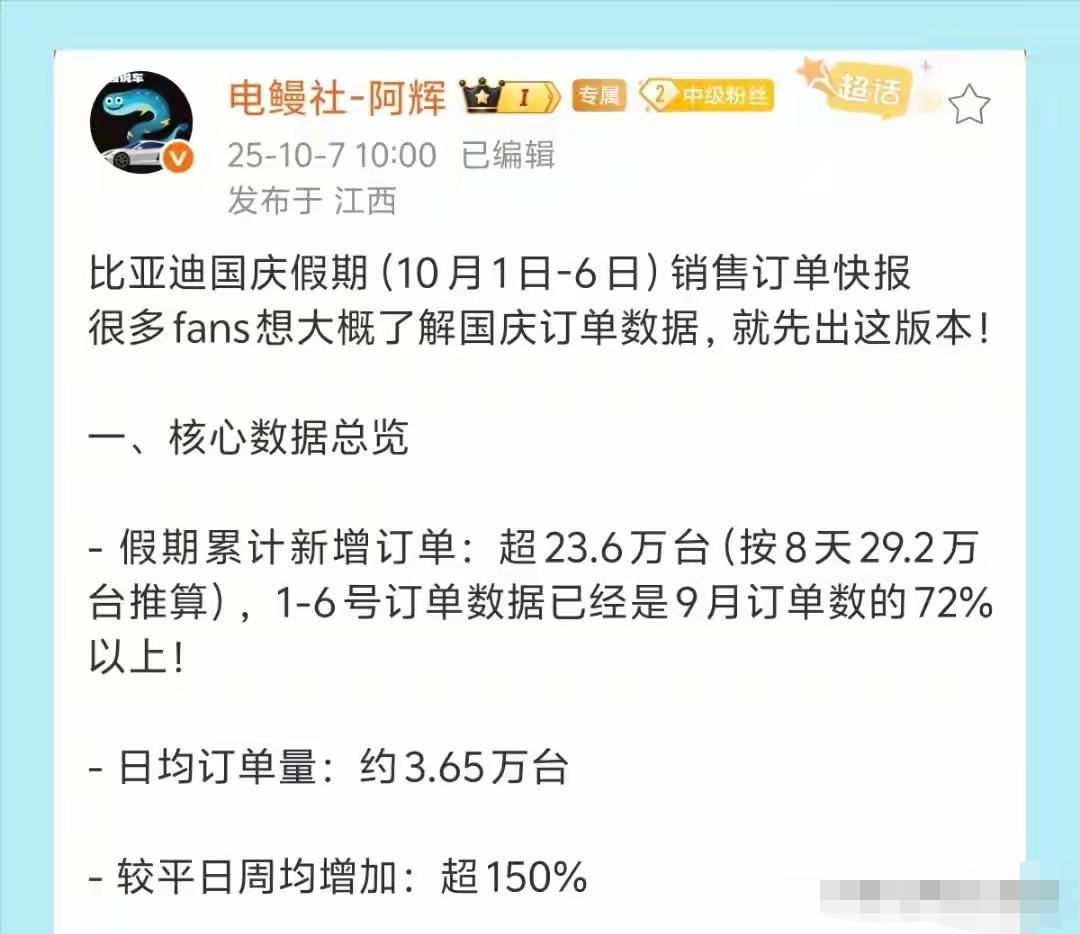 比亚迪这波属实杀疯了!国庆假期10月1日-10月6日,新增订单超23.6万台