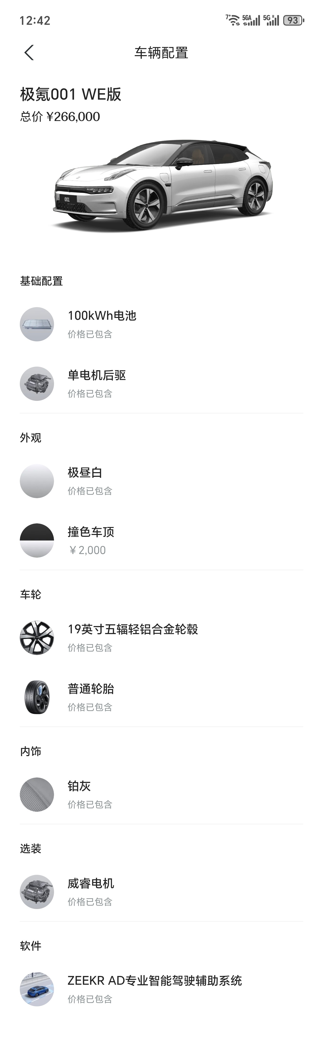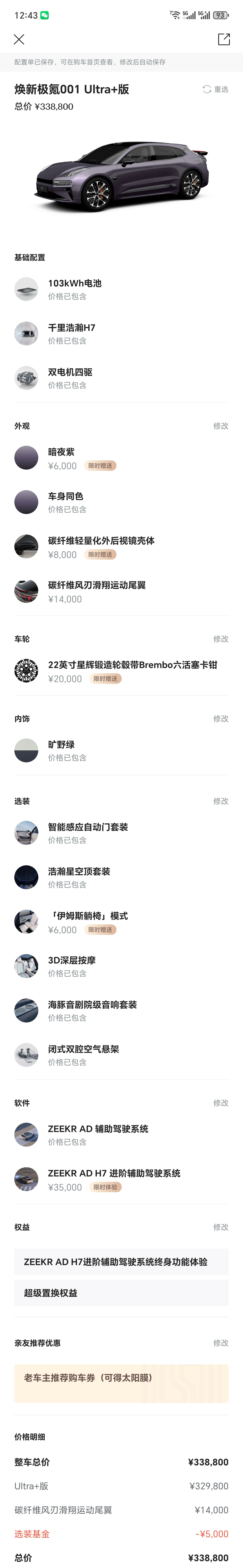 给大家看看我选配下来的焕新版极氪 001,大顶配 Ultra+加个大尾翼,再配上紫外绿内,算上老车主优惠和国补后落地大概 30w 左右