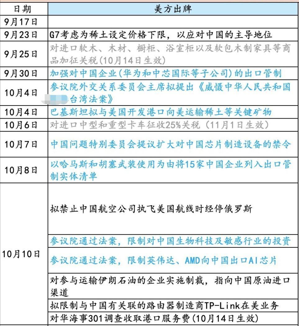 “中国偷走了我们的芯片!”特朗普在 Truth Social 的咆哮冲上热搜,可热评第一却是张外网表格:左侧一栏美国制裁日期,右侧一栏中国反制日期,红箭头清一色向左——谁先动手,一目了然。 博主配文:“泼妇骂街前,请先看清时间线。”短短两小时,转发破十万。华盛顿发言人紧急灭火,称稀土管制“令人意外”,网友回怼:“意外?你们先挥的刀,怪别人挡?” 我看来,这张表格才是最佳外交辞令——无需翻译,日期会说话。当“制裁”成了日常,就别怪“反制”成为习惯。 接下来轮到美方出牌,会不会先查查元素周期表再张嘴?评论区交给你。