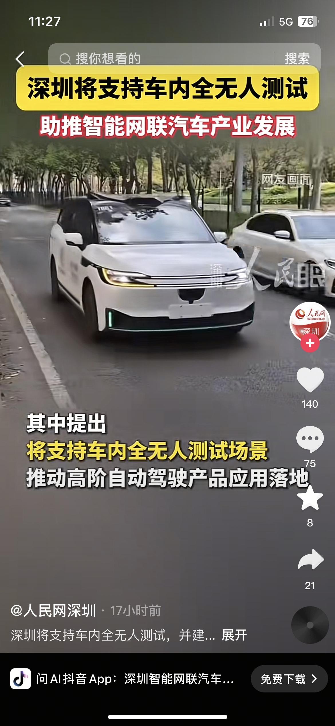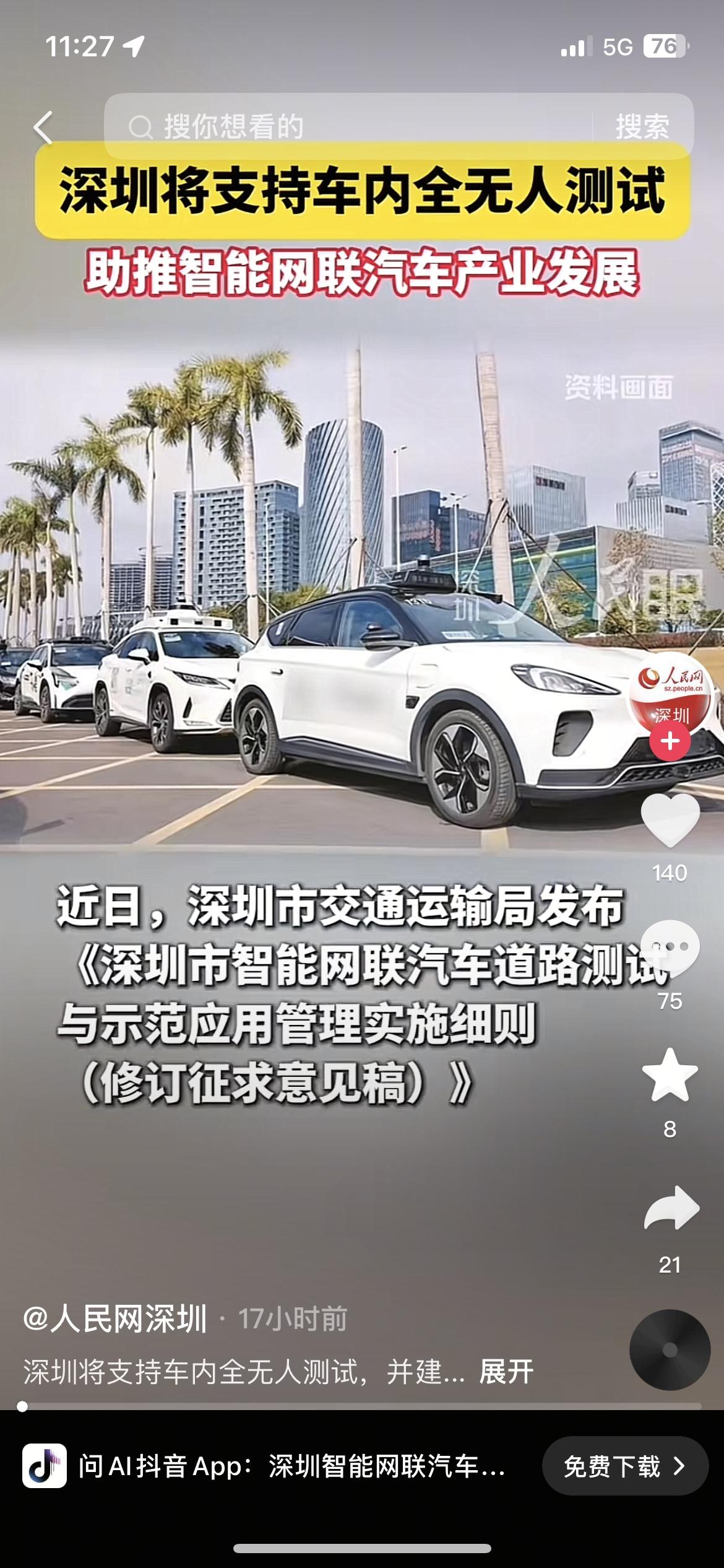 深圳放大招支持车内全无人测试!智能网联汽车板块迎来新政策 家人们,咱们来聊聊深圳刚出的这个智能网联汽车政策对A股的影响。 近日,深圳市交通运输局发布了《深圳市智能网联汽车道路测试与示范应用管理实施细则(修订征求意见稿)》,明确要支持车内全无人测试场景,还建立异地互认机制,简化流程吸引国内企业来深圳开展无人化测试。 从板块关联来看,这属于智能网联汽车、自动驾驶领域的政策事件,A股里的智能网联汽车板块,像涉及自动驾驶系统、整车制造、传感器等环节的个股可能会受市场情绪关注。从客观视角讲,这类政策利好短期或对板块情绪有带动,但具体走势还要结合行业发展、个股基本面等多方面因素。 你觉得深圳这个全无人测试政策对智能网联汽车板块的影响如何?来评论区聊聊~ 本文仅为市场信息解读,不构成任何投资建议,据此操作风险自担 A股热点 深圳自动驾驶 智能网联汽车 智能驾驶新规 自动驾驶平台 智能网联大会 自动驾驶新标准