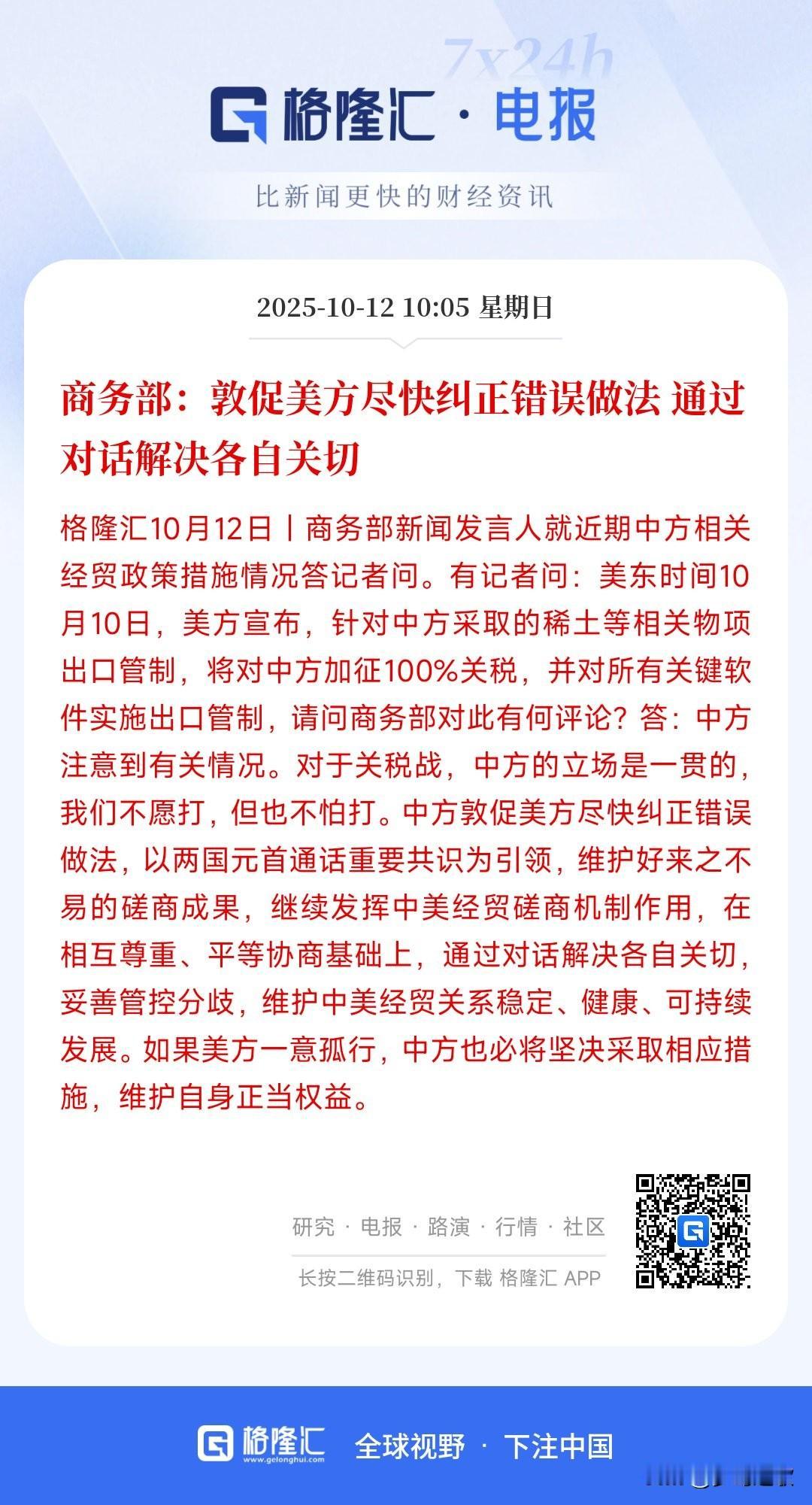 对于关税战,中方的回应还是那么的强硬,这次特朗普的算盘怕是又要白打了 从回答记者问就可以看出,中国表达出的想法就是如果打关税战,中方一点不怕,如果不打关税战,中方也可以和你坐下来谈。 记得上一次4月份的关税战,就是特朗普加多少关税,中国就加多少,完全就是对等反制,最后就是坐下来谈判的,然后美国得到了稀土,但不包括军用的,民用的也得到了一个月的用量。 这次如果关税战打起来,预计美国本土产业又要停滞了,稀土管制起来将会1克也不会出口给美国。 特朗普100%的关税就是一句空谈,最后受伤的还是本土制造业。