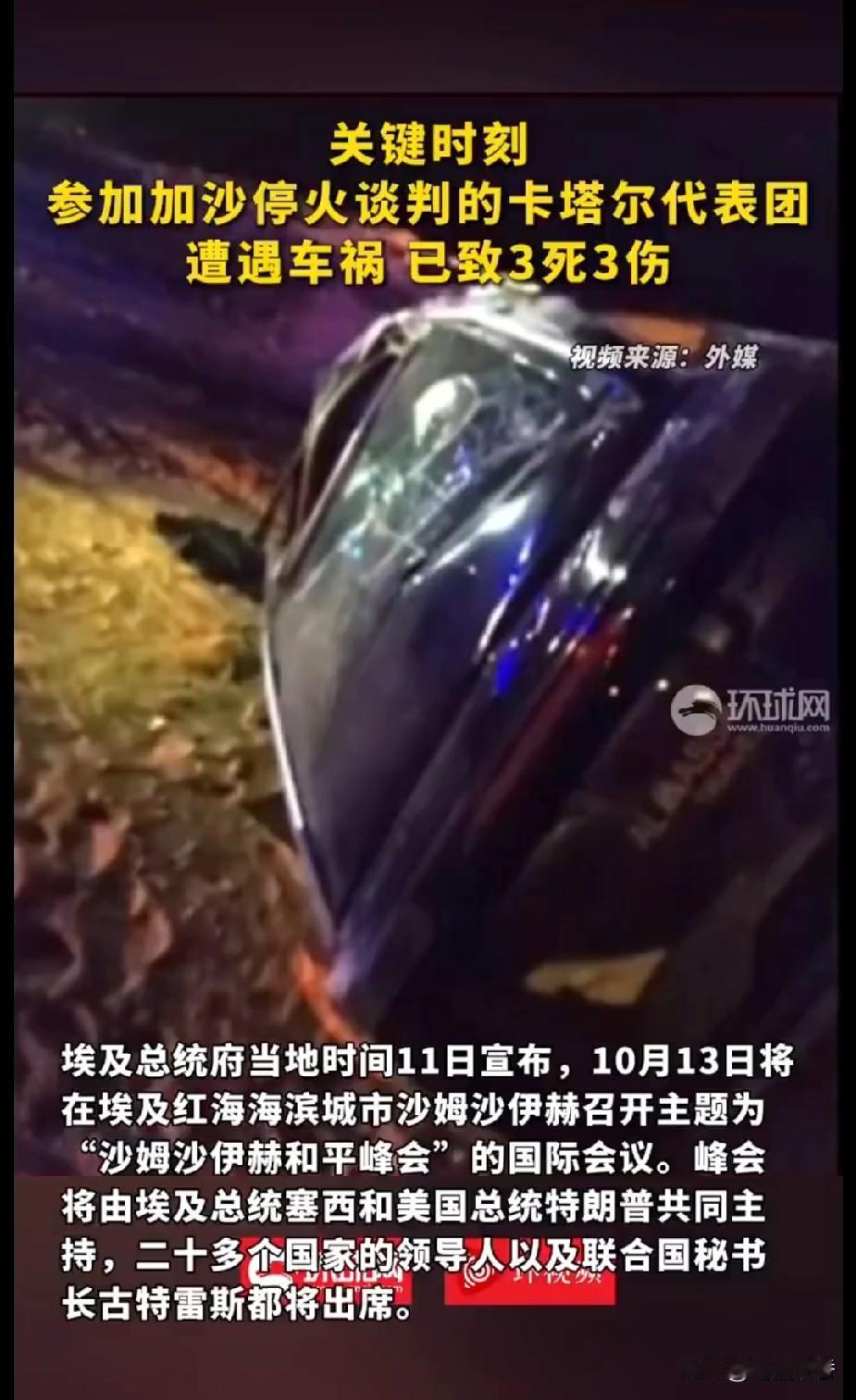 卡塔尔驻埃及大使馆12日在社交媒体上发文说,三名正在当地执行公务的卡塔尔官员在距离埃及度假胜地沙姆沙伊赫50公里的一条公路上发生车祸死亡,事故还造成两名卡塔尔官员受伤。 帖文同时附上卡塔尔驻埃及大使馆关于这次事故的阿拉伯语版声明。声明对上述人员不幸遇难表示深切悲痛,并表示使馆方面已与埃及有关部门展开后续工作。 这场发生在埃及沙姆沙伊赫公路上的事故,不仅夺走了三条鲜活生命,更给本就脆弱的巴以停火谈判蒙上了阴影。 当前新一轮停火谈判正在埃及、卡塔尔等多方斡旋下艰难推进。以色列与哈马斯虽就第一阶段停火达成初步共识,但和平之路依然布满荆棘。 值得关注的是,埃及即将主办的沙姆沙伊赫和平峰会,届时多国领导人将共商和平大计——这束微光恰恰印证了国际社会对巴勒斯坦问题的持续关切。 和平的代价总是如此沉重。