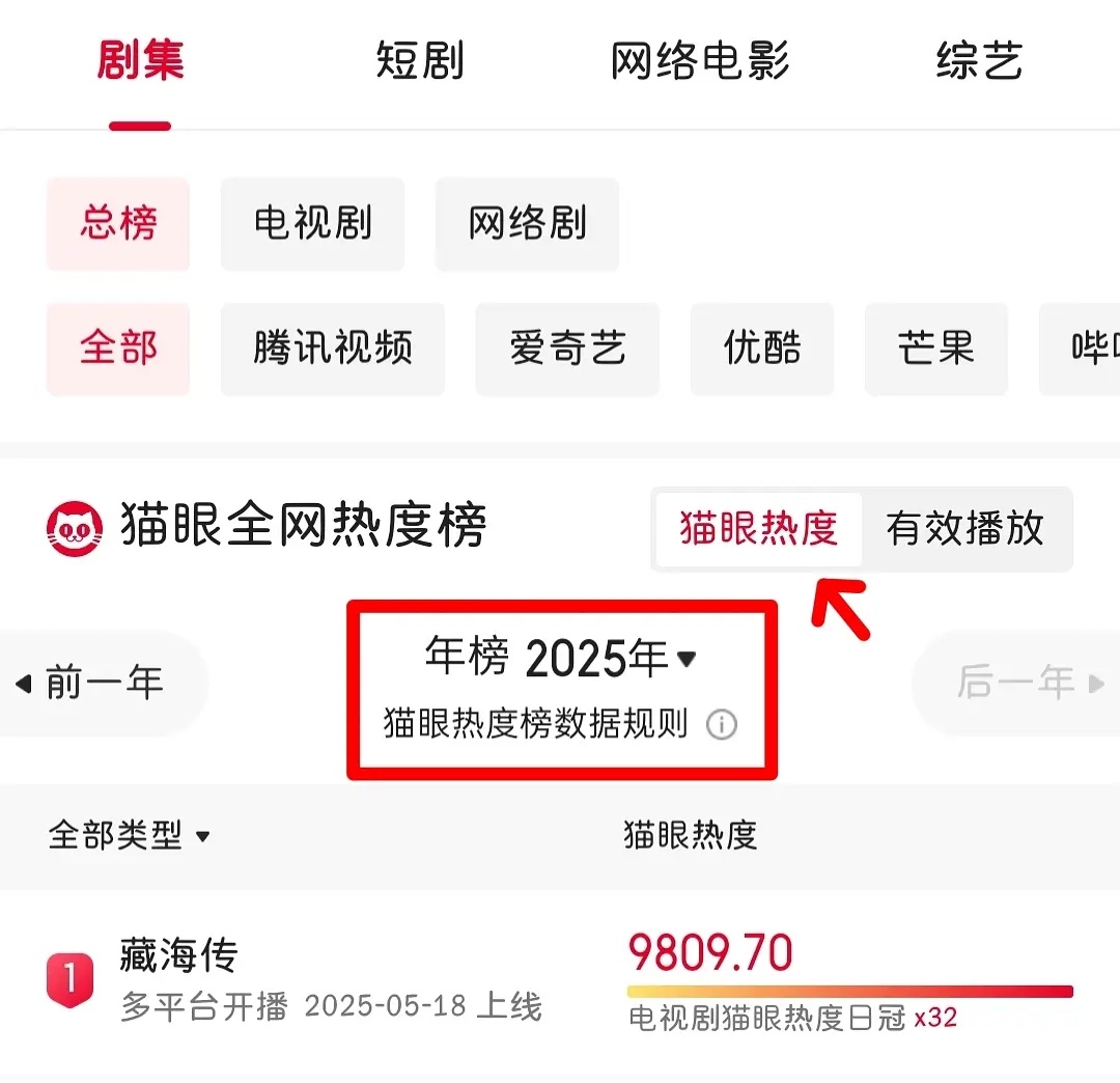 截止目前,【猫眼热度】和【猫眼播放量】,年度第一都是藏海传