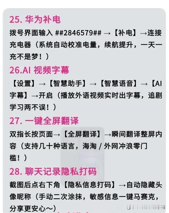 原来华为手机里藏着这么多实用功能,我用了3年才发现第28条能彻底保护隐私,赶紧收藏! 华为这些隐藏功能真的太实用了!比如智慧识屏双指长按就能提取图中文字,AI字幕实时翻译外语视频,还有无线传能反向给其他手机充电。但最厉害的是第28条隐私保护功能,可以生成虚假信息防止App跟踪,自动屏蔽敏感权限申请,再也不用担心个人信息泄露了! 华为隐藏功能 手机使用技巧 隐私保护 数码小知识 你用华为还发现过哪些超实用功能?快来评论区分享你的独门秘籍!