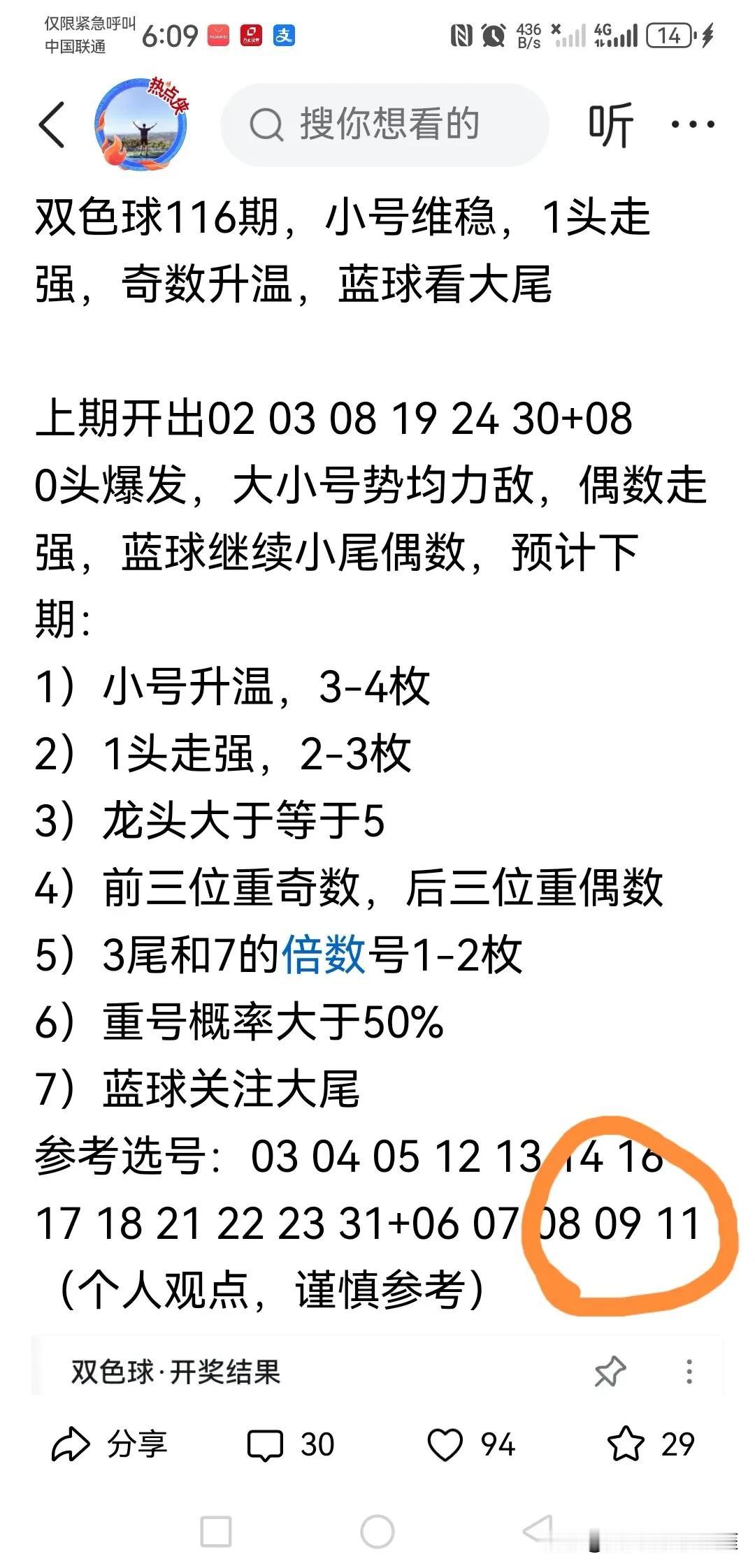 双色球蓝球选择的小技巧 双色球蓝球是决定投注成败的关键,16选1,概率远比红球要低,我的办法是把他们掰开了,揉碎了,看个究竟,再下手。 和红球一样,我也把他们分成大小,单双,质合,012路,2580尾,369尾,147尾,大尾,小尾等几大类,每一个号码归属于不同类别,比如上期的09就可以归于大号,大尾,0路,合数,单数类别。 仔细观察之前多期出号所属的共同类别,判断对立类别的遗漏情况,如果遗漏的奇数较多,就得引起注意了。 例如,上期09出现之前,已经连续出6期偶数,147尾连续7期未出,大尾连续2期未出,0路号4期未出,大大高于正常概率,那么0路,大尾,奇数和147尾出现的可能性就大起来了,但147都属于1路号,近期出号正常,所以可以优先排除。 这样一来剩余选项就是大尾,奇数,0路就成了最优选择,所以我也选择了09,避免某些人说我马后炮![捂脸] 总而言之,蓝球选择非常重要,也还是有技巧的,值得花时间甄别。