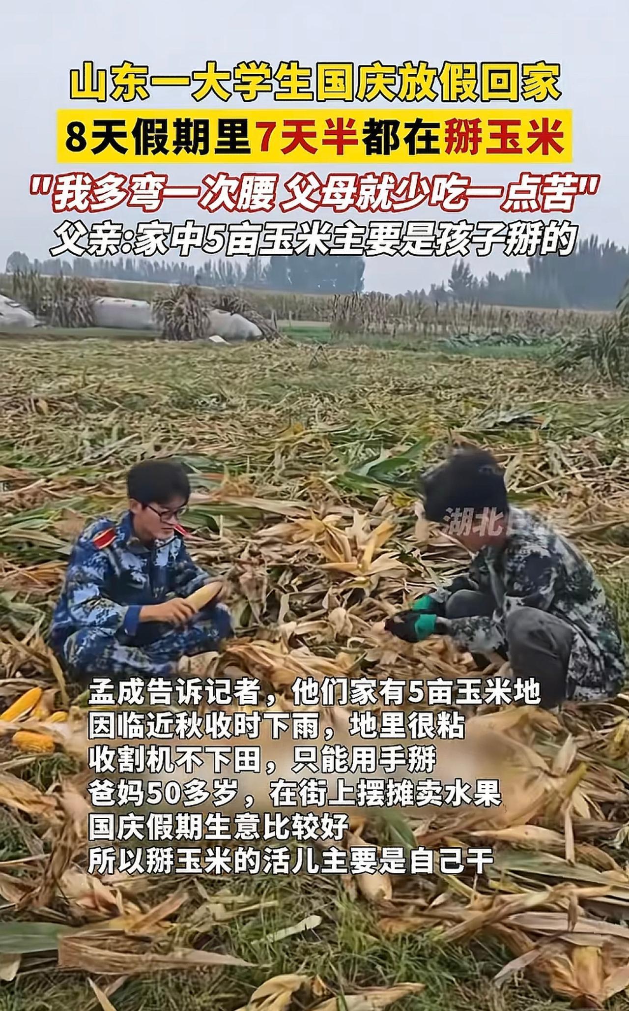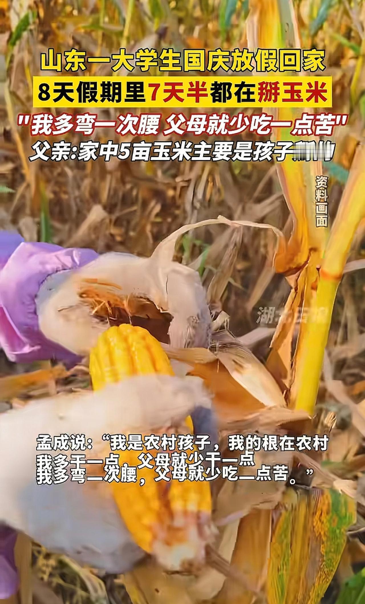 这句“我是农村孩子,我多干一点,父母就少干一点”,感动了全网。 现在哪里还有孩子国庆放假8天,在家干8天活的,都说农村的孩子早当家,记得从工作开始,每年五一播种、十一秋收,都要回家干活,因为活在那,你不干父母就得干,虽然每次累得腰疼、手疼、腿疼,但能帮到就很开心。 虽然每年产不出多少粮食,可却是农村生活的根本,父母想让孩子休息,孩子怕父母累着,这就是为什么农村孩子懂事早的原因。父母也是庄稼人 父母也是普通人 农村孩子