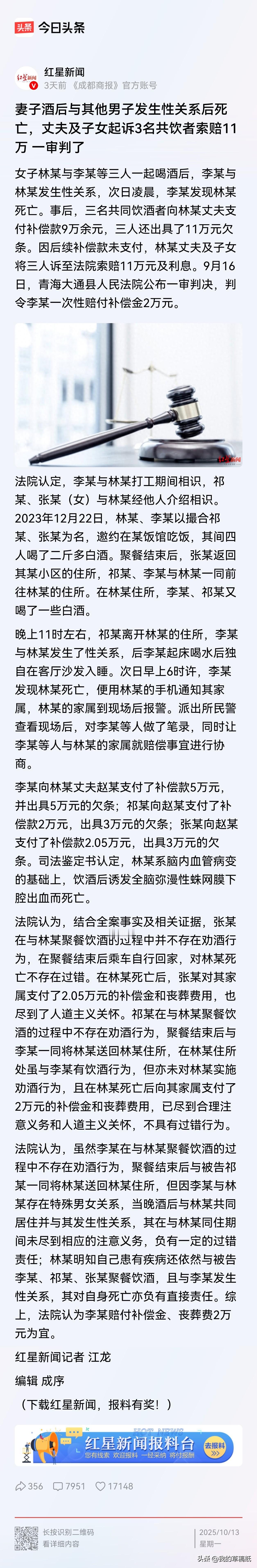 同饮不同责!青海一女子组局聚餐饮酒又与他人在家中发生性关系后身亡,法院判决亮了! 两男两女,一桌四人,两斤白酒,一场以撮合姻缘为名的酒局,最终以一人死亡的悲剧收场。 青海大通县人民法院近日一审判决了一起引发广泛关注的案件:一名女子在与三名同伴饮酒后死亡,法院仅判令其中一名与死者发生性关系的男子承担2万元赔偿责任,其余两名共同饮酒者无需担责。 这起判决清晰地划定了共同饮酒者的法律边界——成年人是自身安全的第一责任人,而共饮者的责任则以“过错”为前提,绝非无限连带。 01 一场酒局,一条生命 2023年12月22日,林某与李某以撮合祁某和张某为名,邀请二人聚餐。 饭局上,四人畅饮超过两斤白酒。聚餐结束后,张某先行回家,祁某和李某则陪同林某返回其住所,并在其家中继续饮酒。 当晚11点左右,祁某也离开林家,只剩下李某与林某独处,二人随后发生了性关系。 事后,李某起床喝水后在客厅沙发入睡,直到次日清晨6时许,才发现林某已无生命迹象。 经司法鉴定,林某的死亡原因是“在脑内血管病变的基础上,饮酒后诱发全脑弥漫性蛛网膜下腔出血”。 02 赔偿分歧,对簿公堂 事发后,在当地派出所的协调下,三名共同饮酒者与林某家属达成了赔偿协议。 李某向林某丈夫支付了5万元补偿款,并出具了5万元欠条;祁某支付了2万元,出具3万元欠条;张某支付了2.05万元,出具3万元欠条。 因剩余的11万元补偿款未兑现,林某的丈夫及子女将三人诉至法院,要求支付欠款及利息。 03 法院明断,责任分明 大通县人民法院经审理后,对三名共同饮酒者的责任进行了区分。 法院认为,张某在聚餐中无劝酒行为,结束后自行回家,对林某死亡不存在过错。 祁某虽在林某家中参与饮酒,但同样无劝酒行为,还与李某一同将林某送回家中,已履行合理注意义务。 唯有李某,尽管聚餐时无劝酒行为且参与送林某回家,但因与林某存在特殊男女关系,酒后共同居住并发生性关系,同住期间未对林某尽到相应注意义务,被判定负有一定过错。 法院同时明确指出,林某明知自身患有疾病仍参与饮酒,且与李某发生性关系,对自身死亡负有直接责任。 最终,法院仅判令李某一次性赔付2万元补偿金及丧葬费,驳回了原告对其他两人的诉讼请求。 04 法理昭彰,界限清晰 这起判决体现了司法实践中对共同饮酒责任认定的明确原则——过错责任原则。 根据《民法典》第一千一百六十五条的规定:“行为人因过错侵害他人民事权益造成损害的,应当承担侵权责任。” 换言之,共同饮酒人是否要承担赔偿责任,关键看其是否有“过错”。 北京市第三中级人民法院的法官祖鹏也曾指出,在涉共同饮酒侵权纠纷案件中,多数会认定饮酒者本人承担主要责任。 共同饮酒人之间的安全注意义务以“必要”为限,法律不会对共饮者苛以过高的要求。 法院的这份判决书如同一把精细的手术刀,剖开了情感的迷雾,切出了责任的边界。 三条不一样的人生轨迹,在法庭上得到了截然不同的司法评价。这正体现了法律的精髓——不搞“各打五十大板”的和稀泥,也不被“谁死谁有理”的情绪所绑架。 杯中物,满与空,关乎情谊;责任酒,轻与重,在于法律。餐桌上的酒可以斟满又空,但法律责任这杯酒,谁满谁空,法律分得清清楚楚。 秋日生活打卡季