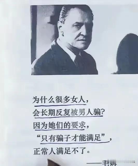 别让不切实际的期待“坑”了自己 不得不说,毛姆这话虽然听着有点扎心,但仔细琢磨还真有道理。 生活里,不少姐妹找对象的时候,心里头那期待值拉满了,要对方又帅又多金,还得24小时随叫随到,把自己宠成公主。可现实是啥样呢?正常人哪有那么多精力和条件,啥都给你安排得明明白白。 这时候,骗子就该登场了。他们嘴上跟抹了蜜似的,啥好听的都能说,给你画各种美美的大饼,说以后要给你买大house、开豪车,把你哄得晕头转向。可等你真信了,投入感情和时间,甚至还有金钱的时候,才发现这就是个泡沫,一戳就破,骗子早就溜之大吉了。 所以啊,姐妹们找对象还是得实际点,那些天上掉馅饼的好事,大概率是陷阱。找个真心对你、踏实过日子的人,比啥都强。 毛姆 毛姆哲学 毛姆智慧