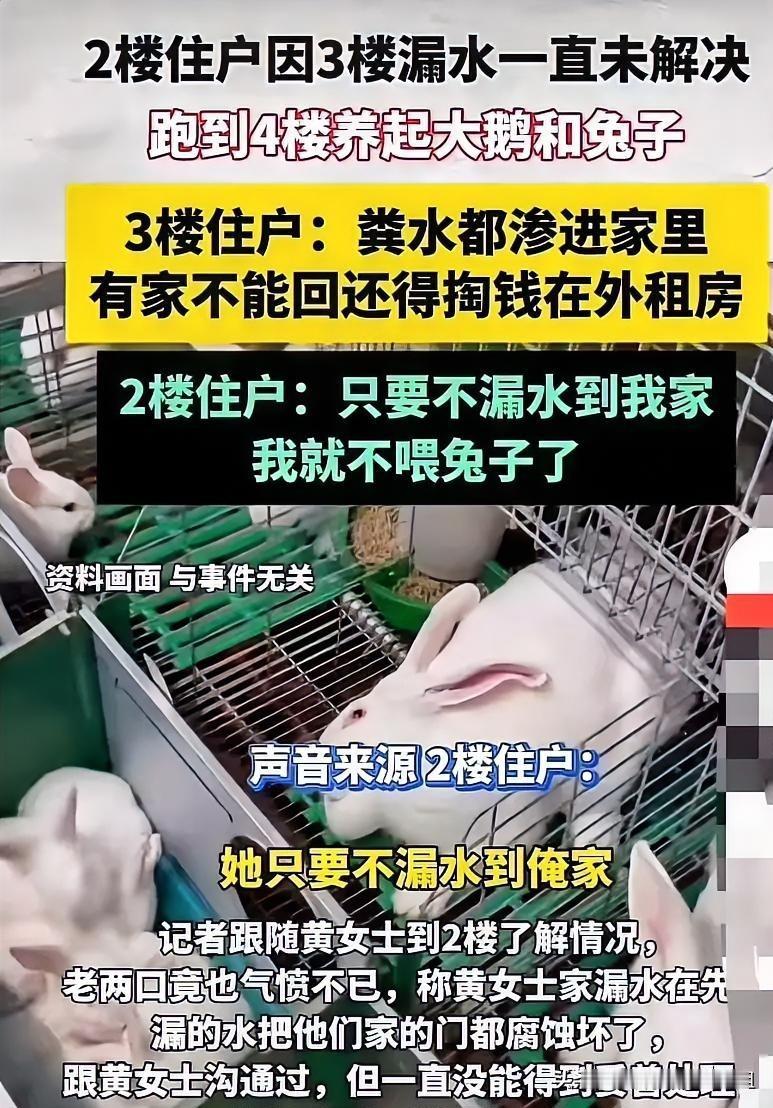 河南许昌,2楼因3楼漏水一直未解决,一怒之下跑到4楼养起大鹅和兔子。因为粪水都渗