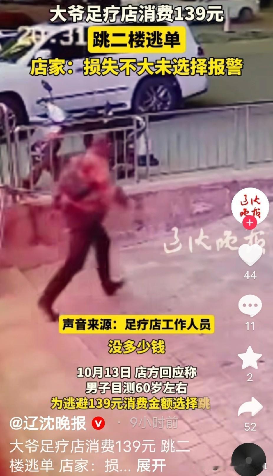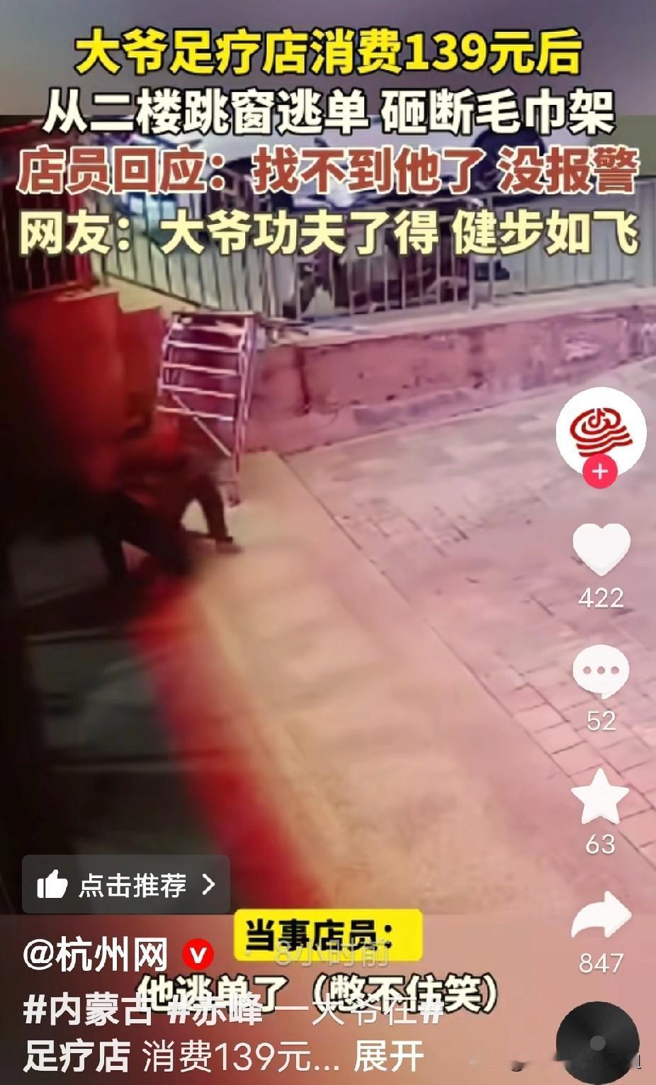 你大爷还是你大爷!内蒙古赤峰,大爷上二楼足疗店后,拒绝买单,紧接着瞅着楼层不高,居然灵机一动,从二楼跳了下来,一溜烟的功夫就跑走了!店家:有时候我真的想报警。 这事儿发生在内蒙古赤峰市一家临街足疗店。一位头发花白、年纪约六十多岁的大爷进店后,先是在价目表前琢磨了一会儿,点了个139元的足疗套餐。享受完服务,他还挺沉得住气,坐在休息区喝了会儿茶,一切看起来都再正常不过。没过多久,大爷起身朝二楼卫生间方向走去,可他并没进卫生间,而是溜达到走廊尽头,探头往窗外看了看,然后利索地打开窗户,一条腿跨了出去。在店员还没反应过来的时候,大爷整个人已经从二楼翻了下去,伴随着“砰”的一声巨响,楼下店铺门口的金属毛巾架被砸断了。让人目瞪口呆的是,大爷居然迅速从地上爬起来,像个没事人似的,快步穿过街道消失在了夜色中。店家后来发现人不见了,找了一圈也没找着,但考虑到金额不大,最终没有报警,自己承担了损失。 这位大爷为了139元玩命跳窗,账算得实在糊涂。二楼高度少说也有3米多,年轻人跳下来都得掂量掂量,更别说一位六十多岁的老爷子。老年人的骨骼相对脆弱,这样的高度极易导致骨折、扭伤,甚至引发更严重的内脏损伤。万一真摔出个好歹,后续的医疗费用恐怕得上万,这可比139元多得多,完全是得不偿失。有网友调侃道:“这回是毛巾架,下回万一砸到人可咋整?这可比139元严重多了。” 大爷这一跳,看似“省了”小钱,实则赌上了自己的健康和更大的经济风险,这笔账怎么算都划不来。 跳窗逃单不仅仅是钱的问题,它触碰了诚信的底线。消费了服务就该付钱,这是天经地义的事,也是社会赖以运行的基本规则。大爷的行为,说轻了是占小便宜,说重了就是强拿硬要,违反了《治安管理处罚法》,如果商家较真报警,大爷可能面临警告、罚款甚至拘留的处罚。类似的事件并非孤例,吉林有理疗馆曾连续遭遇三起跳窗逃单,2023年2月和2025年9月也发生过类似事件。更有甚者,有人因多次吃“霸王餐”被判刑。店家这次选择了宽容,没报警,但这份善良可能被误解。商家坦言,如果大爷确实经济困难,本可以商量减免费用,跳窗实在不是明智之举。店家不追究的做法虽然展现了包容,但也有人担心这会变相纵容不当行为。 这件事也反映出一些服务行业面临的尴尬。为了防范逃单,不少店家不得不采取一些措施,比如引入手牌管理系统,或者培训员工留意一些可疑行为,像频繁出入卫生间、故意拖延时间等。这无形中增加了运营成本,也可能让诚信顾客感到不被信任。开小店做生意本就不易,还要时时提防这种意外损失,难怪店家会觉得无奈。 跳出这个具体事件,我们或许该想想,为什么有些人会为小利冒大险、失大信。是确实遇到了难处,还是一时糊涂,或是习惯了占小便宜?无论原因如何,跳窗逃单这类行为,不仅让自己面临法律风险和安全隐患,更损害了社会诚信的基础。为了一百多块钱,赌上老胳膊老腿,丢了个人的脸面,实在不值得。 各位读者你们怎么看?欢迎在评论区讨论。