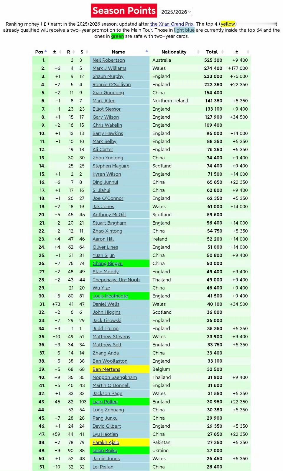 凭借西安大奖赛夺冠奖金17.7万英镑,马威世界排名升至第四,前三依然是特囧罗,马