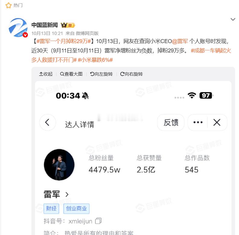 有媒体通报,“近30天,雷军先生社媒账号掉粉29万多"。