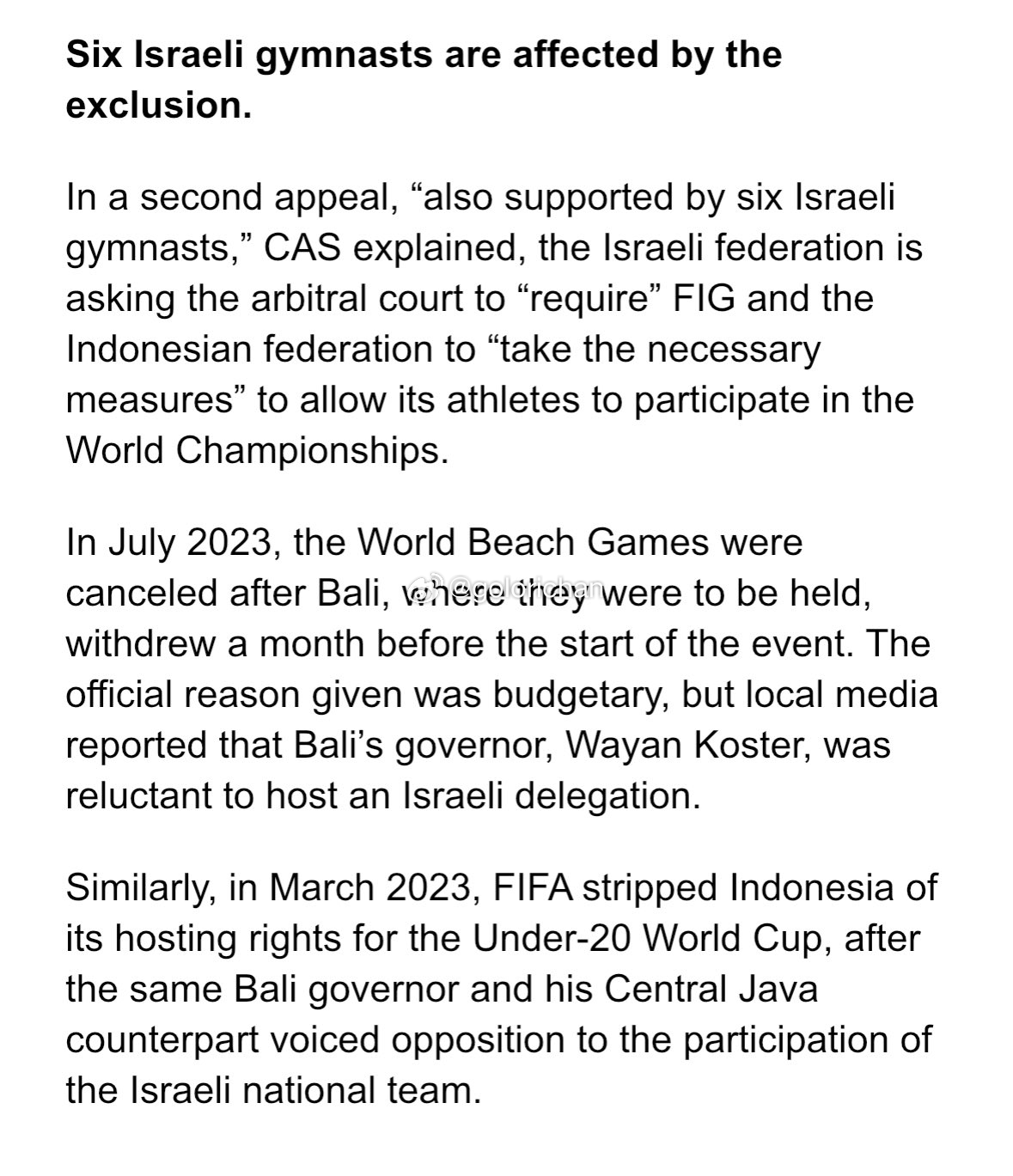 上次印尼把以色列签证拒了后以色列向CAS申诉,要求是要么放行以方运动员,要么移地或取消本届世锦赛。