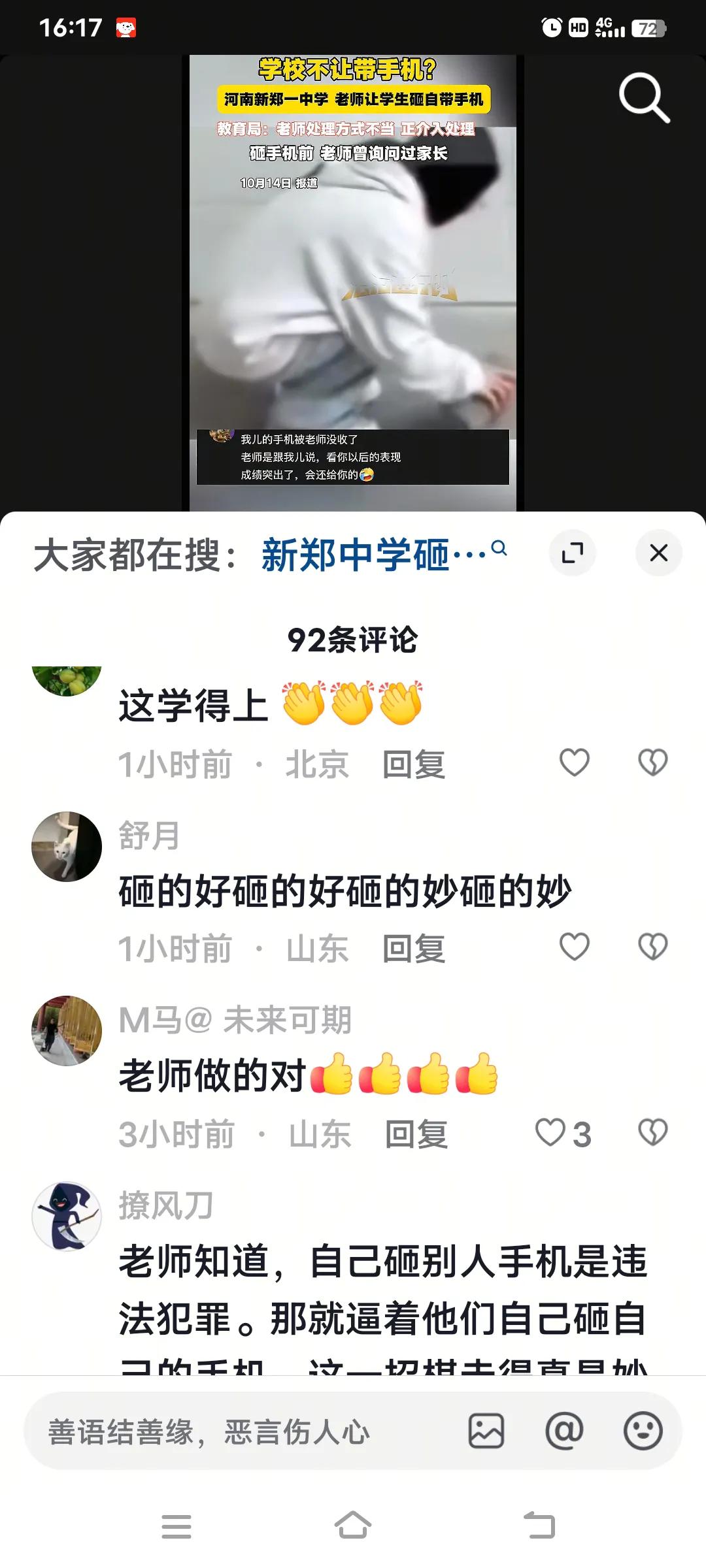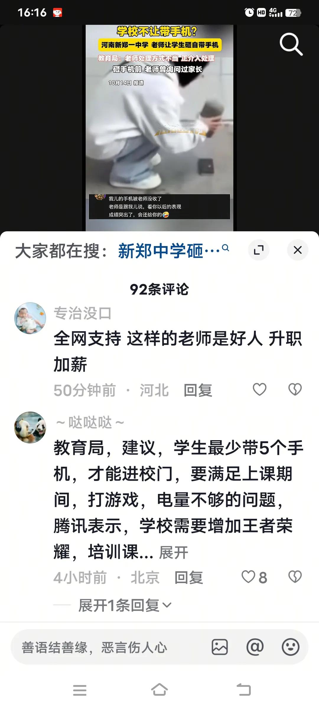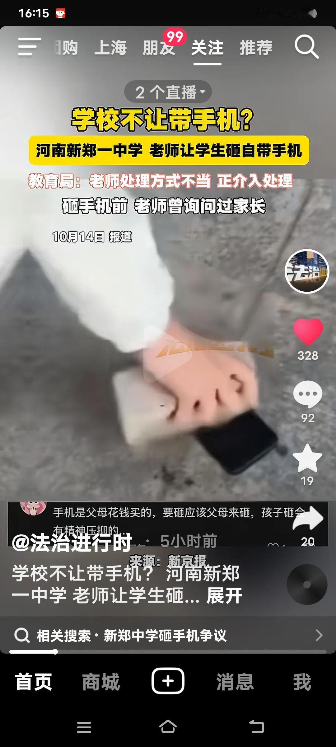 河南新郑中学砸手机事件闹得沸沸扬扬。10月11日流出的视频里,老师让学生用砖头砸自带手机,女生砸手机前老师曾问过家长。 在此,有的家长说,他儿子的手机被老师没收了,看他以后表现如何?如果表现好了以后还还给他。还有的家长说,她儿子的手机是她花钱买的。等各种 这事儿引发网友大讨论,有人 觉得没收就行,毁物没必要;有人觉得学校严格管理能防沉迷,就是心疼手机;也有人说方式极端,会引发逆反心理。13日教育局回应,称老师初衷好但方式欠妥,已介入调查老师怒摔手机 新郑中学 !