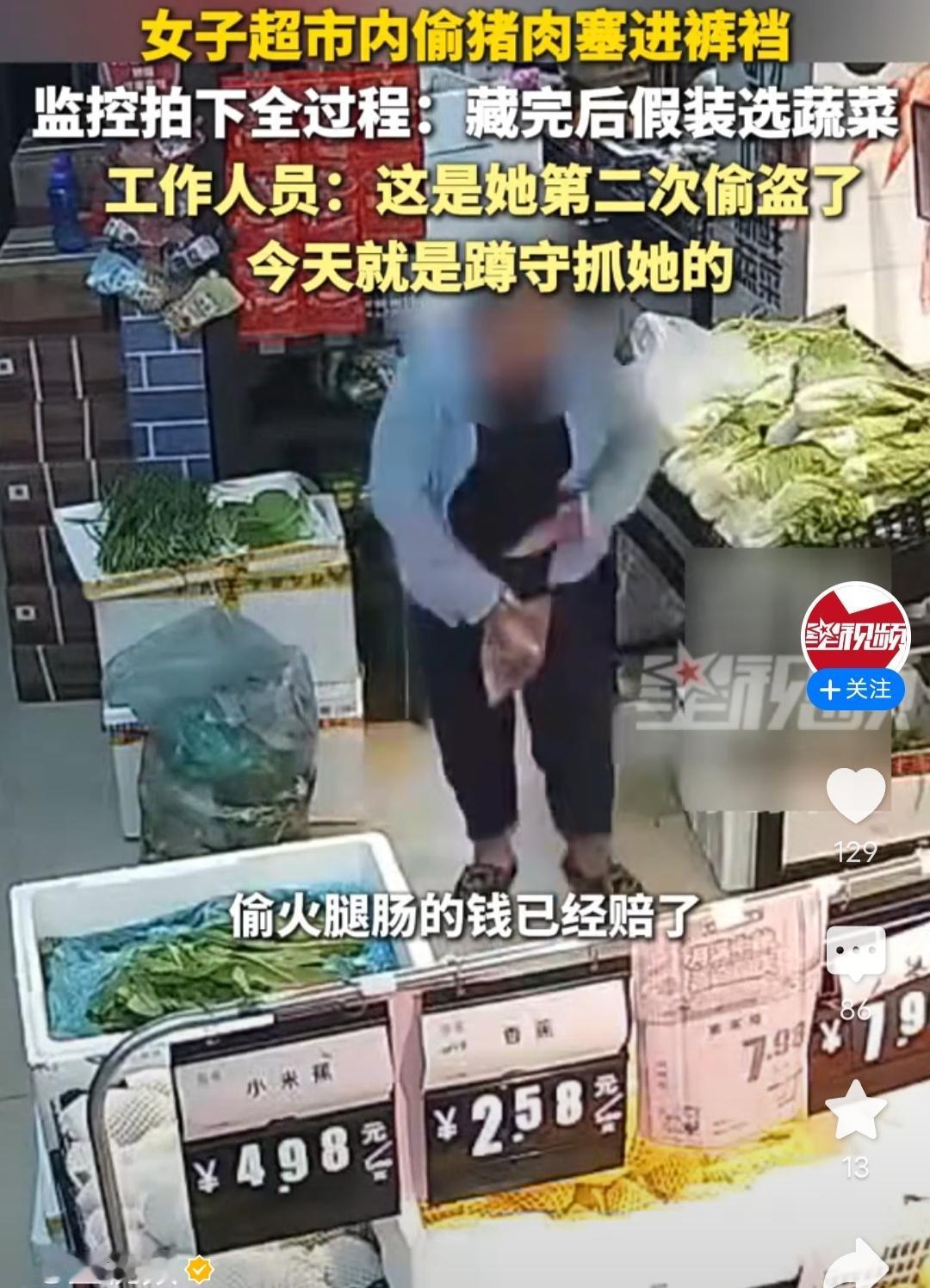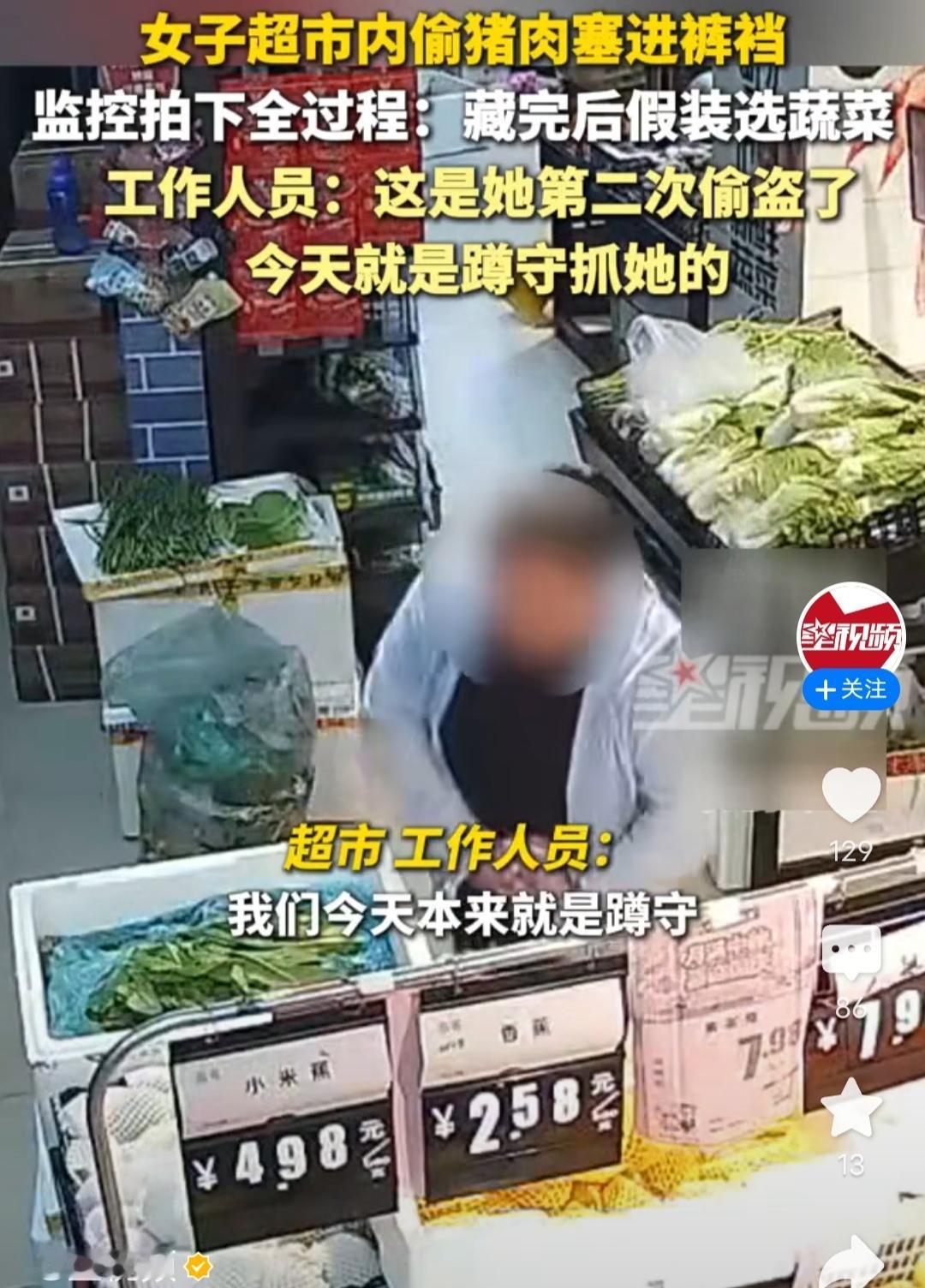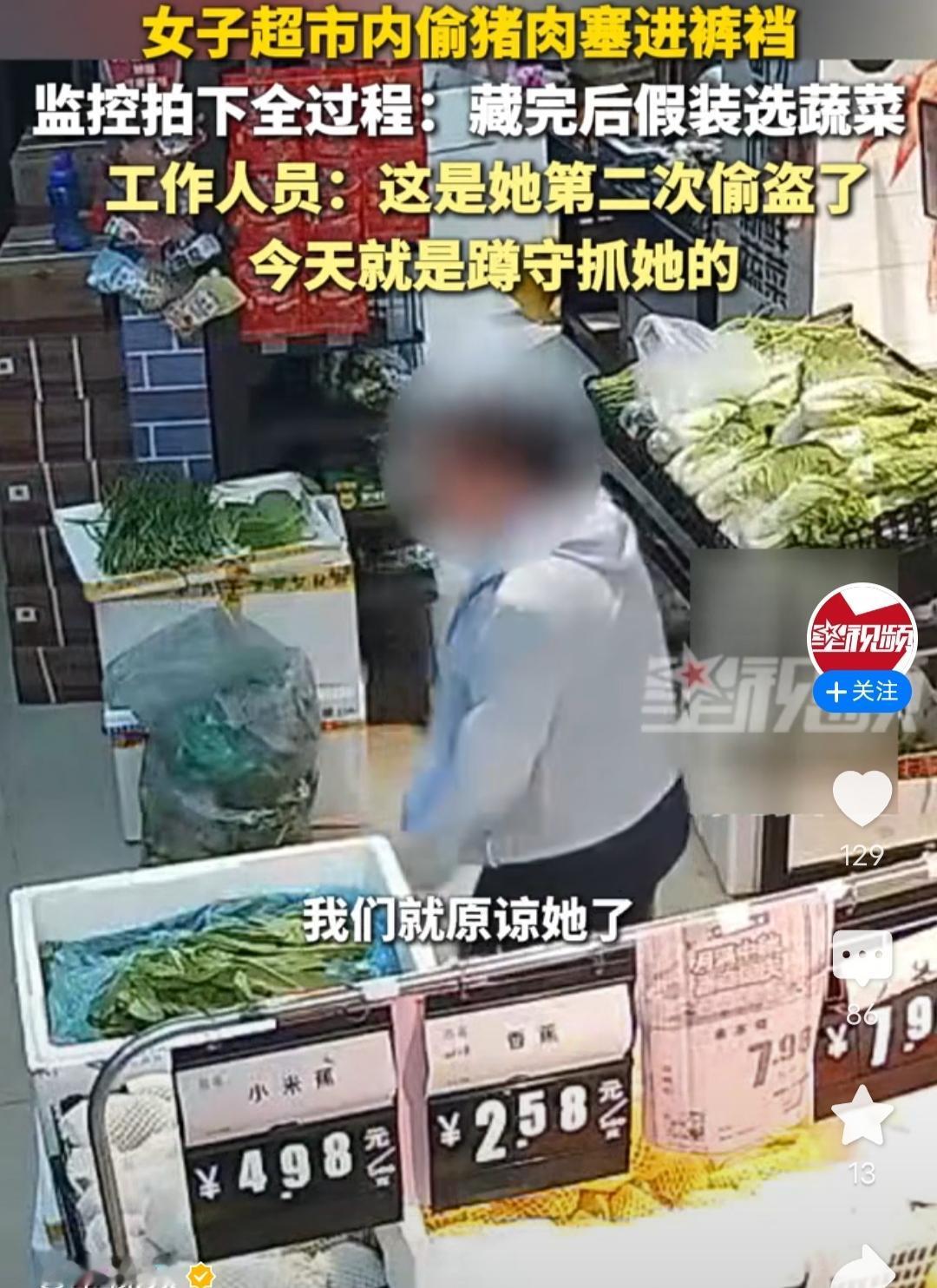 女子超市内偷猪肉塞进裤子,藏完后假装选蔬菜,监控拍下全程!工作人员:今天就是蹲守