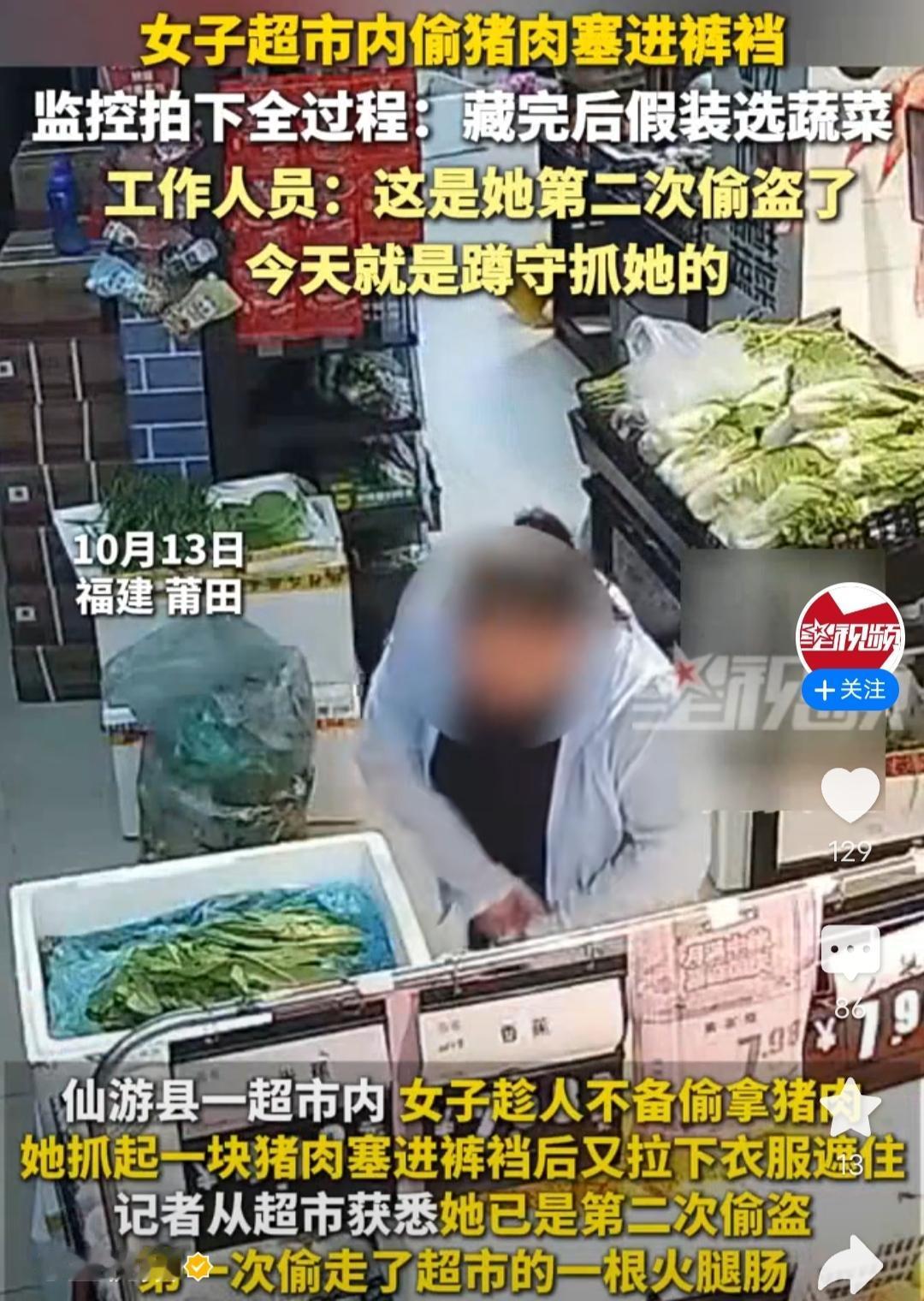女子超市内偷猪肉塞进裤子,藏完后假装选蔬菜,监控拍下全程!工作人员:今天就是蹲守抓她的! 相关媒体平台看到这样一个报道,这事发生在福建莆田仙游县一个超市内,从超市的监控里可以清楚地看到,一名女子趁人不注意,抓起一块肉就往裤裆里塞,然后把衣服拉下来盖住,装作没事人一样佯装挑选蔬菜。记者从超市工作人员那里了解到,这是女子第二次来偷盗了,第一次偷的是一根超市最贵的火腿肠,这次又来偷肉,由于当时大家都忙得没工夫,就让她走了。 工作人员还说,第一次偷的火腿肠她的表姐后来给她付过钱了,也带着女子来超市给她们道歉了,超市也原谅她了。 这下网友们在评论区炸开了,我只看了几条,居然有出来带节奏的,而我认为该有的看法应该是这样的,成年人了,不是自己的东西不要拿,想要的东西掏钱买,这是小孩子都懂的道理,这种失德行为,应该重罚并曝光,否则不知悔改! 有的人居然说,说不定人家真的很穷,还什么底层人苦,大概是让人理解之类的,我就不理解这种想法了,这是道德素质问题,跟穷有什么关系? 很多生活贫苦的人,也都在靠自己的双手撑起自己的生活,也懂得廉耻,自己有手有脚,绝不干那没骨气,有违道德,触犯律法的事。像这样的不齿行为,就是该狠狠惩罚的,不能助长这种失德行为!