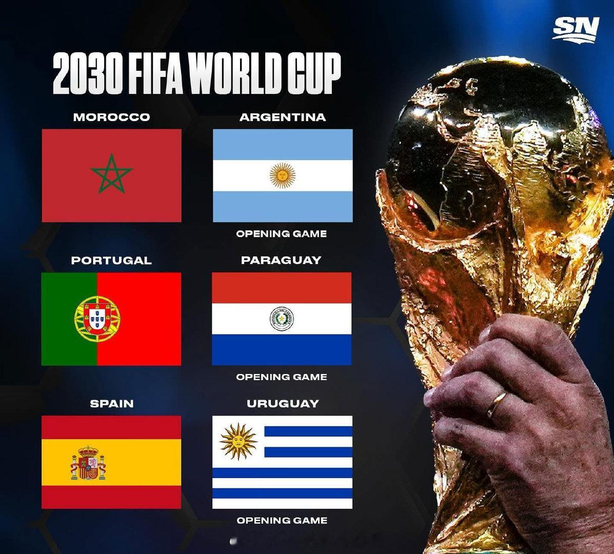 1、2030年世界杯,西班牙、葡萄牙、摩洛哥三国合办。
