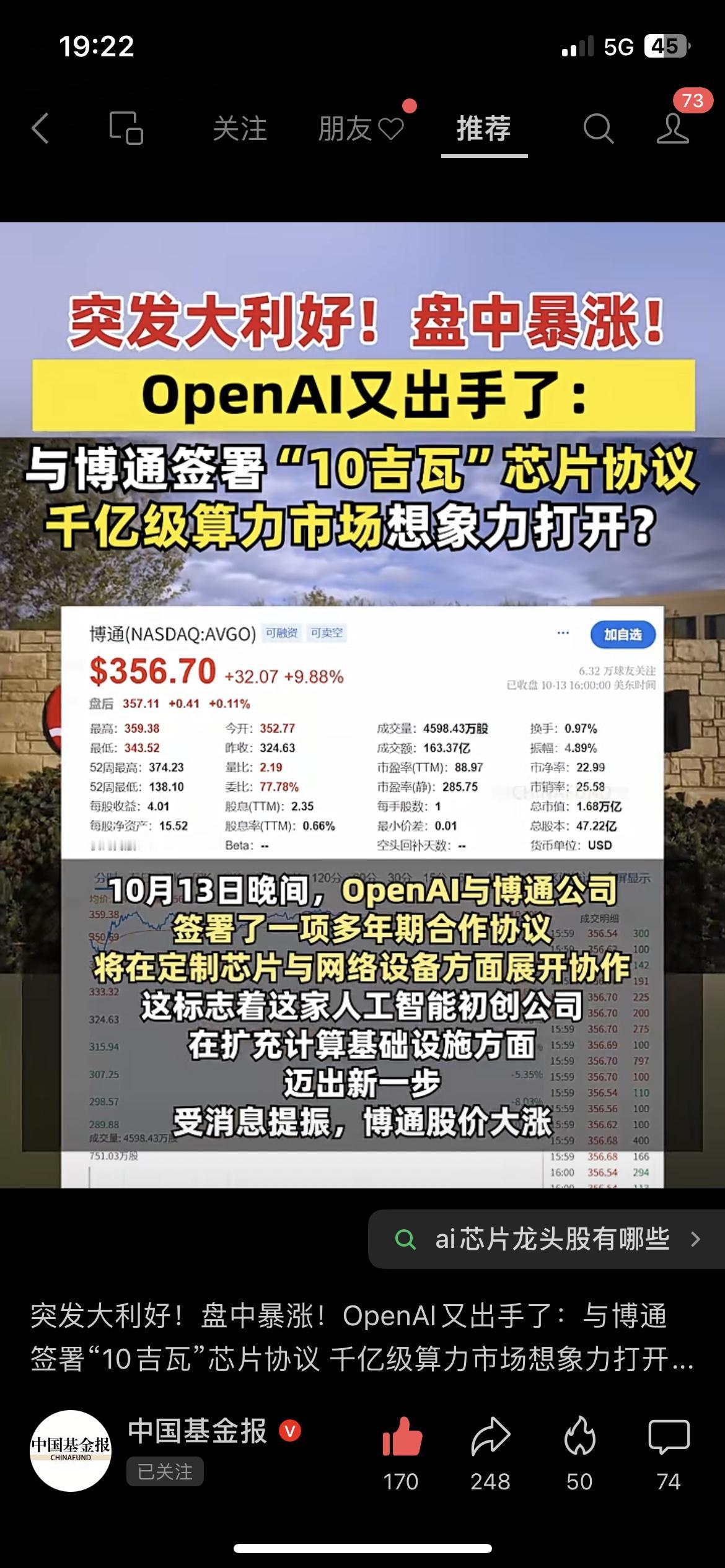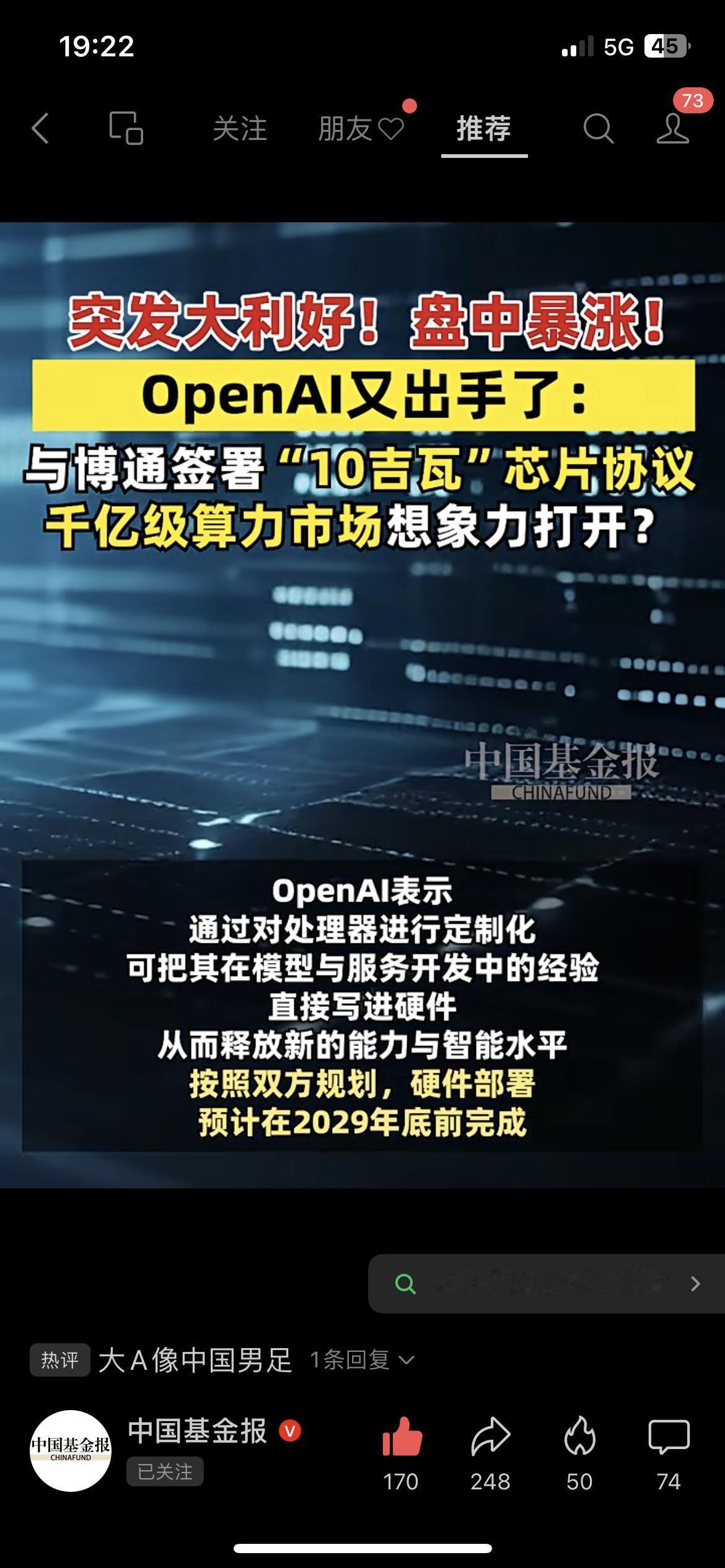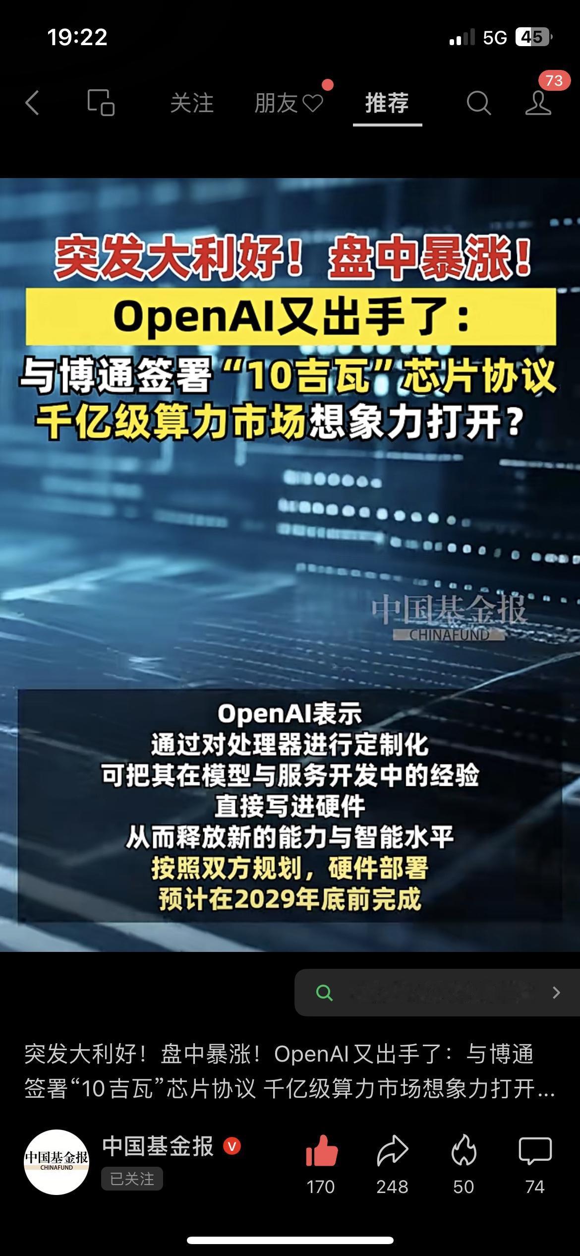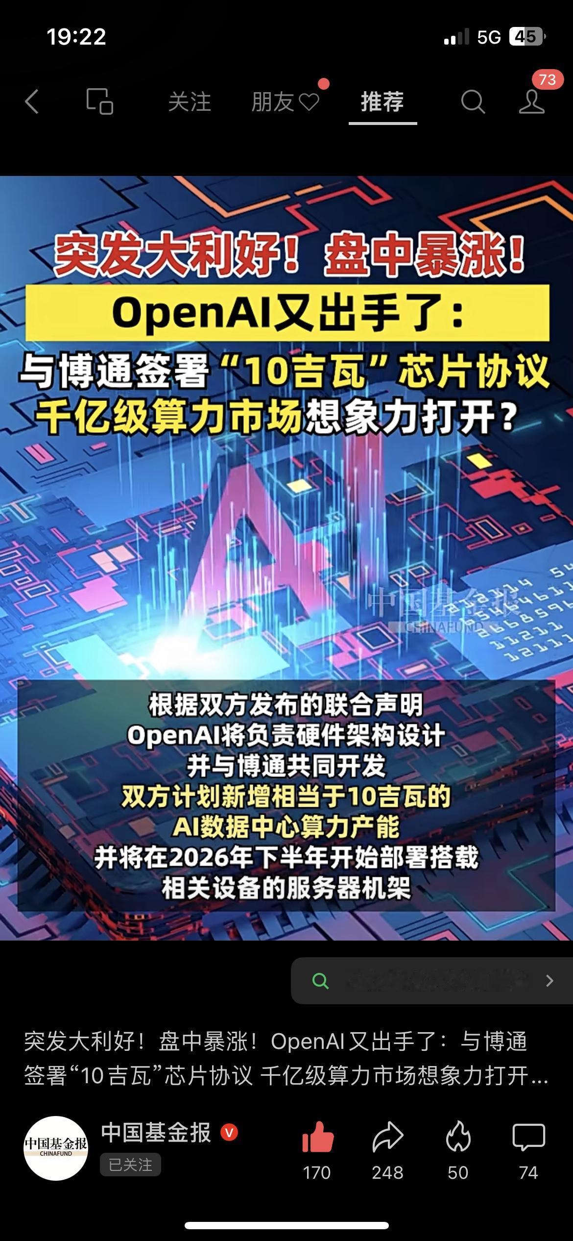 A股算力板块炸了!OpenAI联手博通签“10吉瓦”芯片协议,千亿市场要起飞? 家人们,10月13日晚间OpenAI放大招了!和博通签署多年期合作协议,要在定制芯片、网络设备上搞事情,还计划新增10吉瓦AI数据中心算力产能,2026年下半年就开始部署服务器机架。 受这消息刺激,博通股价直接大涨近10%! 从板块关联看,A股的算力、AI芯片、数据中心这些板块,可能会因为这个合作受到市场情绪关注。 从客观视角分析,这种巨头合作释放出算力领域的积极信号,不过具体板块走势还要结合后续合作落地、行业需求等多方面因素。 你觉得算力板块这波能持续吗?来评论区聊聊~ 本文仅为市场信息解读,不构成任何投资建议,据此操作风险自担 A股热点 OpenAI博通合作 算力板块AI算力新格局
