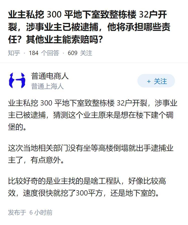 业主私挖300平地下室致整栋楼32户开裂,涉事业主已被逮捕,他将承担哪些责