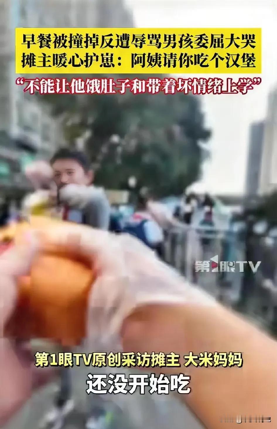 “太贴心了!”贵州贵阳,一名男孩早上拿着早餐去上学,突然早餐被一名路过的大人撞倒在地,男孩要求对方赔偿,反遭对方辱骂,委屈得当场落泪。 男孩越想越难过,拿着手里的电话手表,给妈妈打电话,委屈的说道:“妈妈,我的早餐被一个叔叔撞到地上了,他还吼啊,不赔我早餐!” 这一幕刚好被旁边的一们卖汉堡的阿姨看到了,看到小男孩在电话里,越说哭的越伤心,眼泪止不住的往下掉,阿姨心疼坏了。 没想到,阿姨立即上前安慰道:“小朋友,是不是身上没带钱,买不了早餐了?” 男孩委屈的点点头,阿姨目光柔和,亲切的说道:“今天的这顿早餐阿姨请了!” 接着,阿姨把一个汉堡递到男孩的手中,男孩看到阿姨送的汉堡,不知道说什么好,只是一个劲的点头,说道:“谢谢阿姨,我明天一定把早餐钱还你。” 阿姨只是一个劲的安慰男孩,让男孩安心的上学去了,在她的心里,看不得孩子受委屈,只希望孩子不要饿着肚子,带着不好的心情上学。 这一幕被阿姨转发到网上,网友纷纷留言: 有的说:“这大人也真是的,这么对待孩子好意思吗?” 也有的说:“这个阿姨大有爱心了,一定会发大财的。” 还有的说:“小男孩好勇敢,敢和大人顶撞,果然是个男孩汉,长大一定有出息。” 在这个平凡的清晨,一场意外的冲突映照出人性的两面:有人对孩子的委屈漠然以视,甚至恶语相向;却也有人愿以温柔之手,抚平陌生心灵的褶皱。 卖汉堡的阿姨用一份免费的早餐,不仅填饱了孩子的肚子,更守护了他对世界的信任。而男孩的诚实与感恩,也让这场小小的“遭遇战”有了温暖的终章。 这世间虽有风雨,但总有一把伞为你而撑。为阿姨的善良点赞,也为孩子的勇敢鼓掌! 来源:第一眼