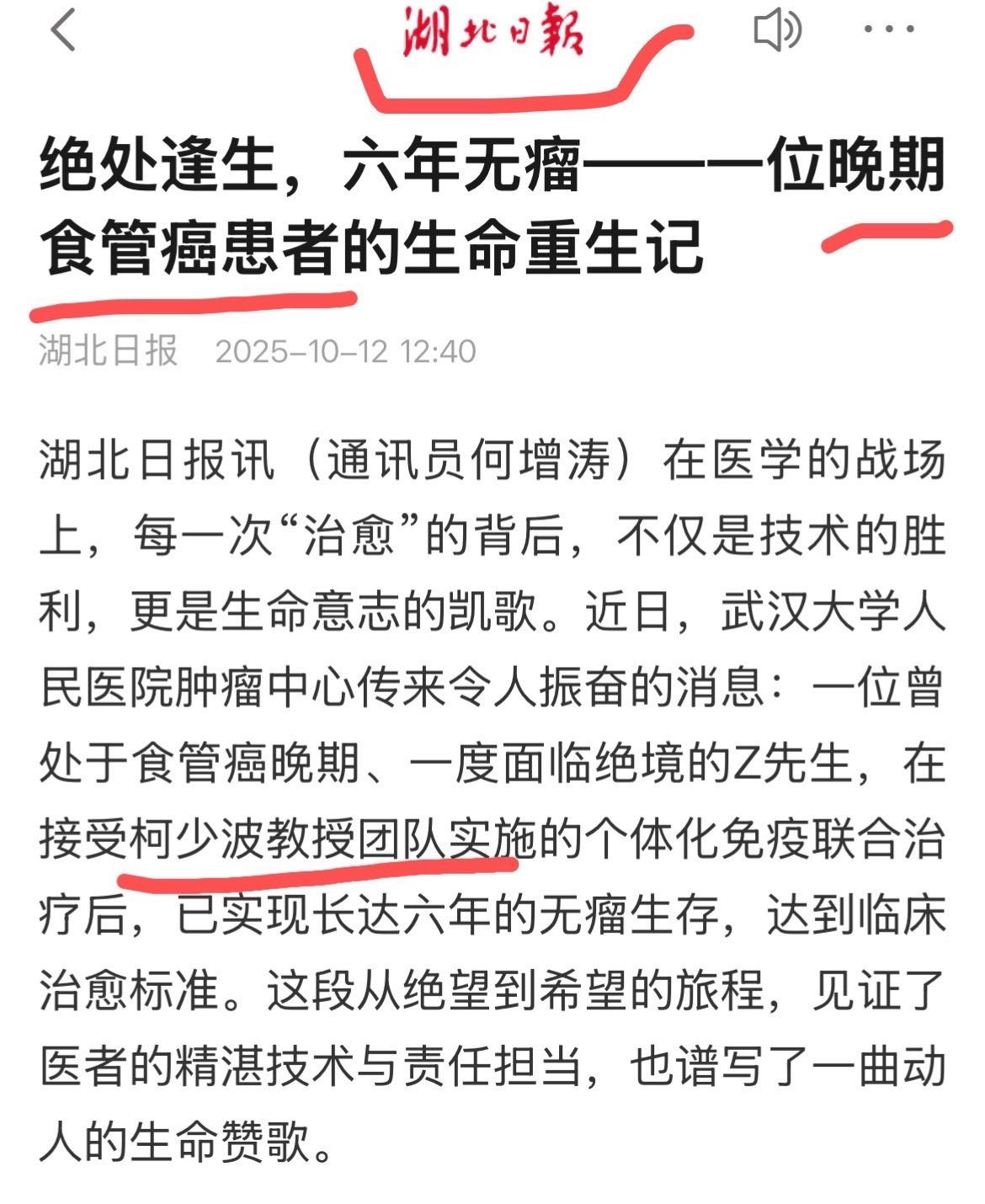 晚期食管癌:绝处逢生!绝处逢生,六年无瘤——一位晚期食管癌患者的生命重生记。湖北日报!