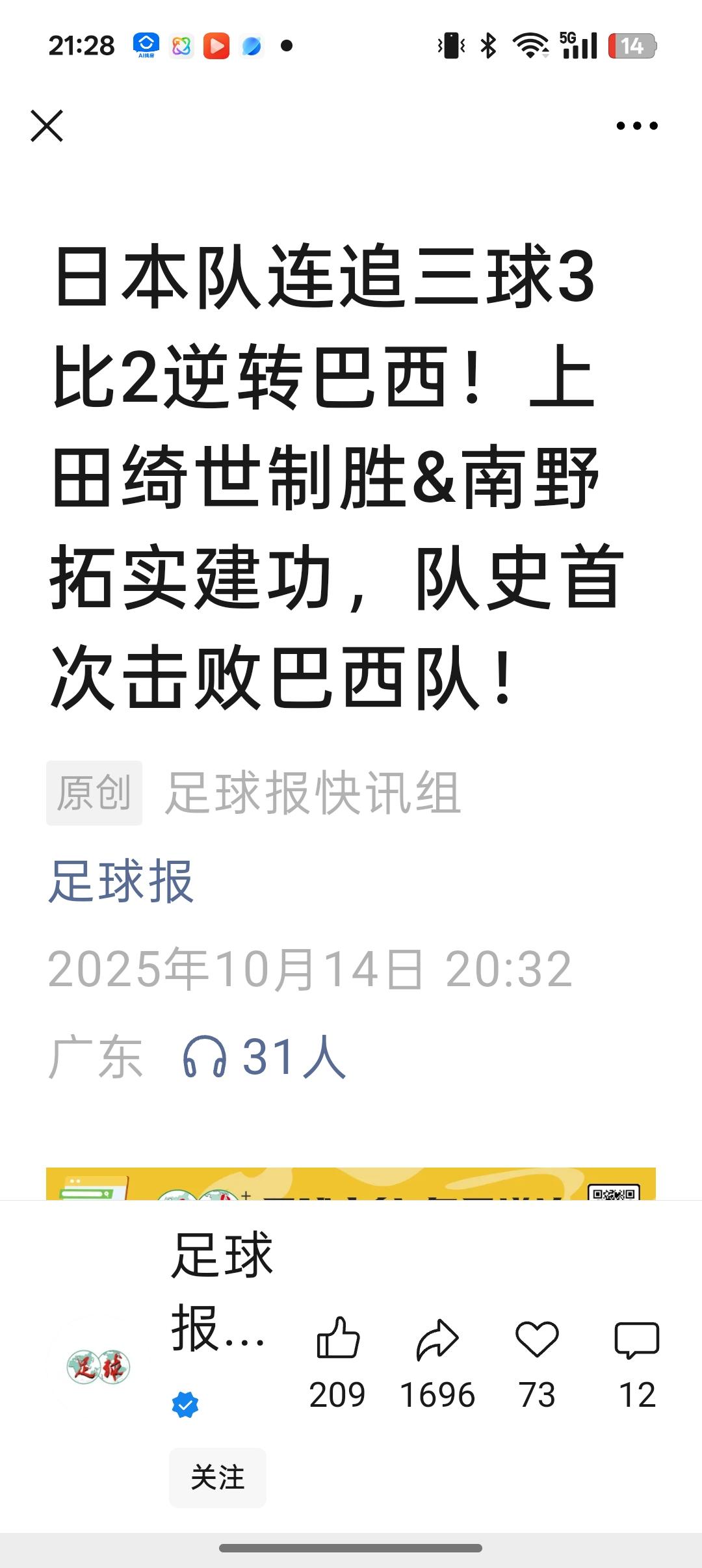 北京时间10月14日晚,2025年麒麟挑战杯,日本队对阵巴西队的比赛在东京体育场举行。上半场日本队先失2球,下半场日本队逆风翻盘,3比2首次战胜巴西队。 巴西队世界排名第6,日本队排第19。两队共交手过13次,日本队成绩2平11负。这次首开记录战胜巴西队,又一次刺痛中国球迷。是再一次棒喝中国男足,揭下他们披了几十年的,亚洲人体质差踢不了足球的遮羞布。 一句话,‘’亚洲人不行,人家小日本怎么行?‘’ 中国男足输日本,输韩国是家常便饭。输泰国,输越南,输印尼,输缅甸,输中国香港……也不稀奇了。 谁在拼搏,谁在拼酒,看看日本队员的八块腹肌,再看看男足的纹身和大肚腩吧!