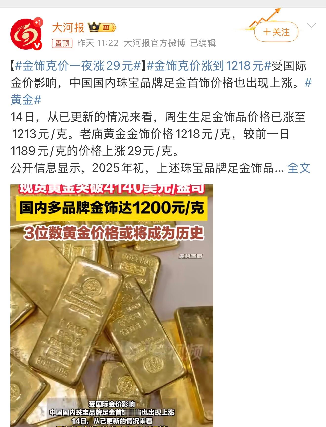 金饰克价涨到1218元
