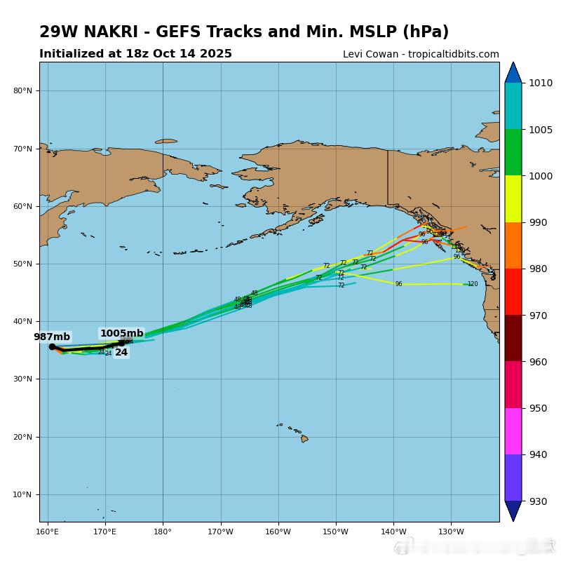 【台风娜基莉停编】今晨台风娜基莉转为温带气旋,中央气象台对其停止编号。娜基莉转变的温带气旋,未来还会继续东移,数值预报给出这个气旋最后可能会影响到加拿大。