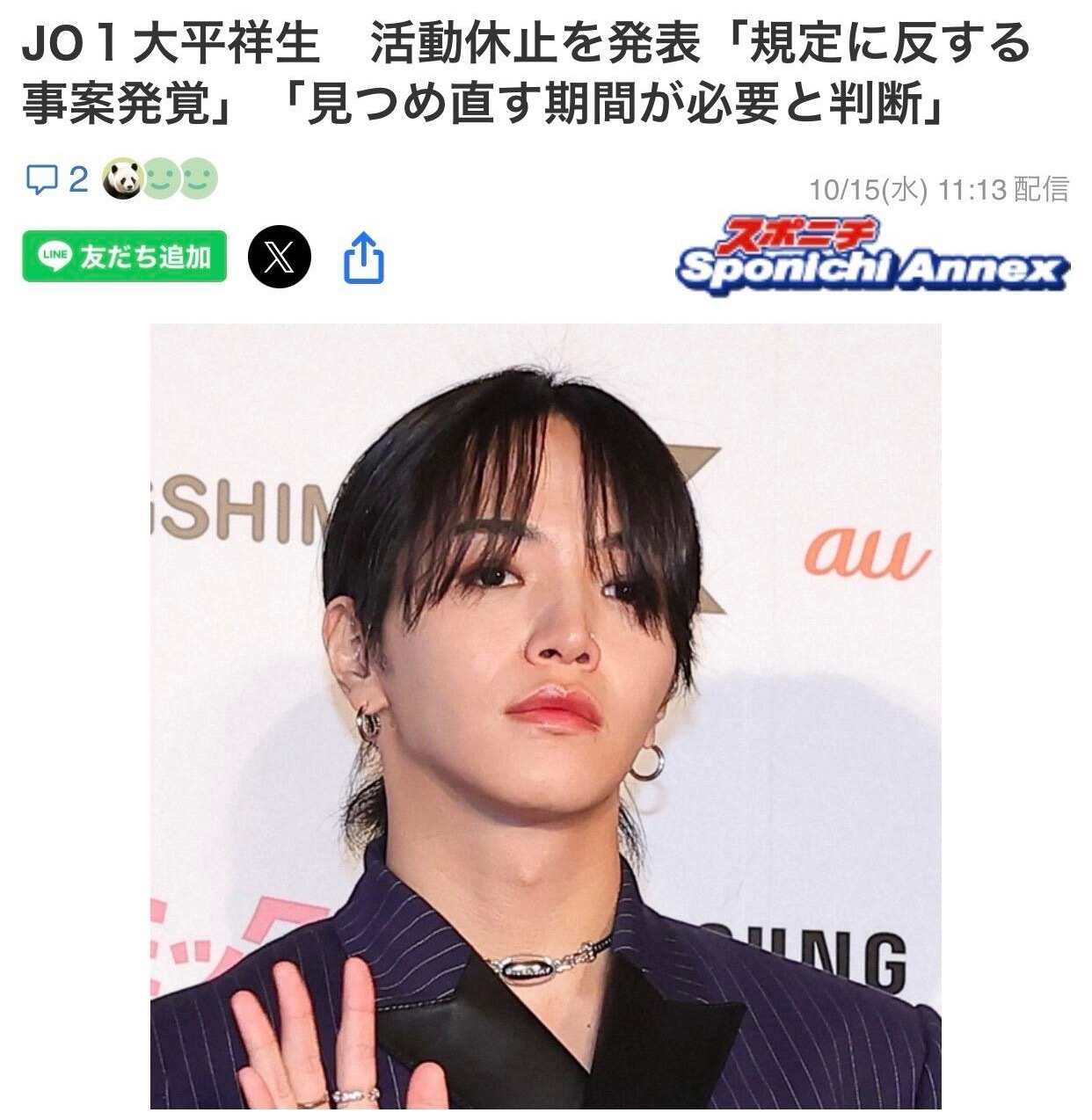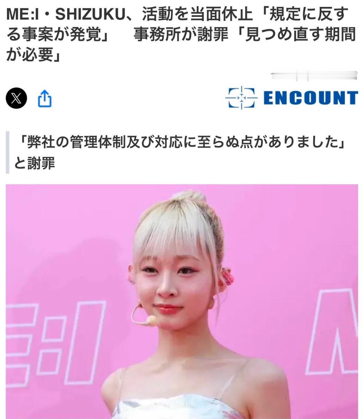 据日媒,日本组合JO1成员大平祥生因违反公司规定而停止活动,ME:I的SHIZUKA也宣告停止活动。两个人都出了停止活动声明。