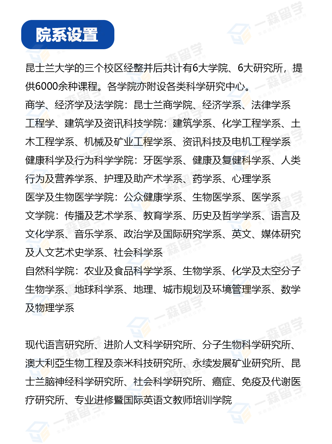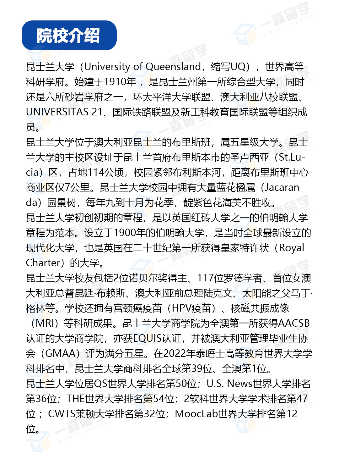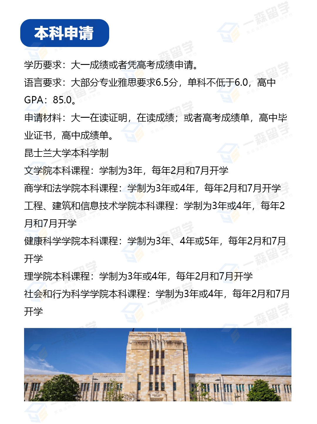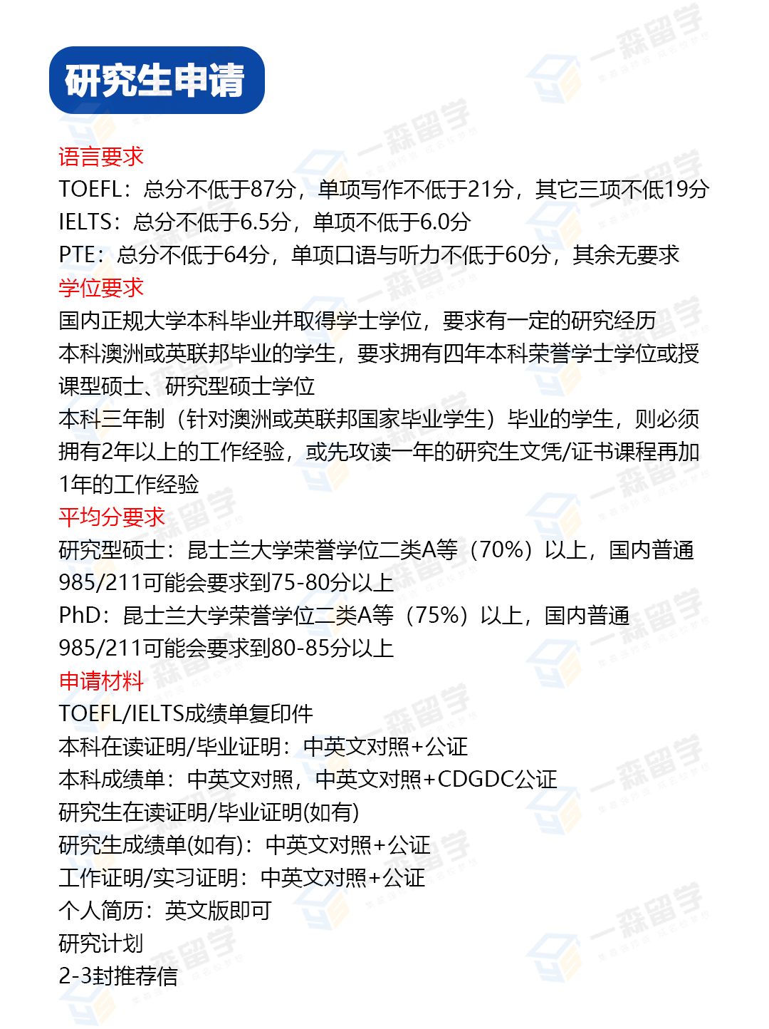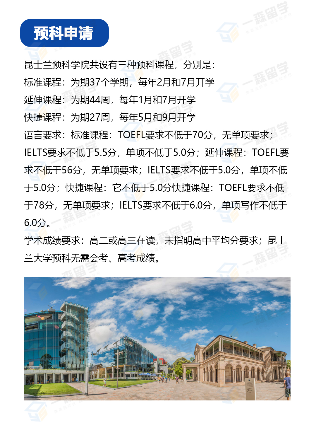 预科申请 昆士兰预科学院共设有三种预科课程,分别是: 标准课程:为期37个学期,每年2月和7月开学 延伸课程:为期44周,每年1月和7月开学 快捷课程:为期27周,每年5月和9月开学 语言要求:标准课程:TOEFL要求不低于70分,无单项要求;IELTS要求不低于5.5分,单项不低于5.0分;延伸课程:TOEFL要求不低于56分,无单项要求;IELTS要求不低于5.0分,单项不低于5.0分;快捷课程:它不低于5.0分快捷课程:TOEFL要求不低于78分,无单项要求;IELTS要求不低于6.0分,单项写作不低于6.0分。 学术成绩要求:高二或高三在读,未指明高中平均分要求;昆士兰大学预科无需会考、高考成绩。 本科申请 学历要求:大一成绩或者凭高考成绩申请。 语言要求:大部分专业雅思要求6.5分,单科不低于6.0,高中GPA:85.0。 申请材料:大一在读证明,在读成绩;或者高考成绩单,高中毕业证书,高中成绩单。 昆士兰大学本科学制 文学院本科课程:学制为3年,每年2月和7月开学 商学和法学院本科课程:学制为3年或4年,每年2月和7月开学 工程、建筑和信息技术学院本科课程:学制为3年或4年,每年2月和7月开学 健康科学学院本科课程:学制为3年、4年或5年,每年2月和7月开学 理学院本科课程:学制为3年或4年,每年2月和7月开学 社会和行为科学学院本科课程:学制为3年或4年,每年2月和7月开学 研究生申请 语言要求: TOEFL:总分不低于87分,单项写作不低于21分,其它三项不低于19分 IELTS:总分不低于6.5分,单项不低于6.0分 PTE:总分不低于64分,单项口语与听力不低于60分,其余无要求 学位要求: 国内正规大学本科毕业并取得学士学位,要求有一定的研究经历 本科澳洲或英联邦毕业的学生,要求拥有四年本科荣誉学士学位或授课型硕士、研究型硕士学位 本科三年制(针对澳洲或英联邦国家毕业学生)毕业的学生,则必须拥有2年以上的工作经验,或先攻读一年的研究生文凭/证书课程再加1年的工作经验 平均分要求: 研究型硕士:昆士兰大学荣誉学位二类A等(70%)以上,国内普通985/211可能会要求到75-80分以上 PhD:昆士兰大学荣誉学位二类A等(75%)以上,国内普通985/211可能会要求到80-85分以上 申请材料: TOEFL/IELTS成绩单复印件 本科在读证明/毕业证明:中英文对照+公证 本科成绩单:中英文对照,中英文对照+CDGDC公证 研究生在读证明/毕业证明(如有) 研究生成绩单(如有):中英文对照+公证 工作证明/实习证明:中英文对照+公证 个人简历:英文版即可 研究计划 2-3封推荐信