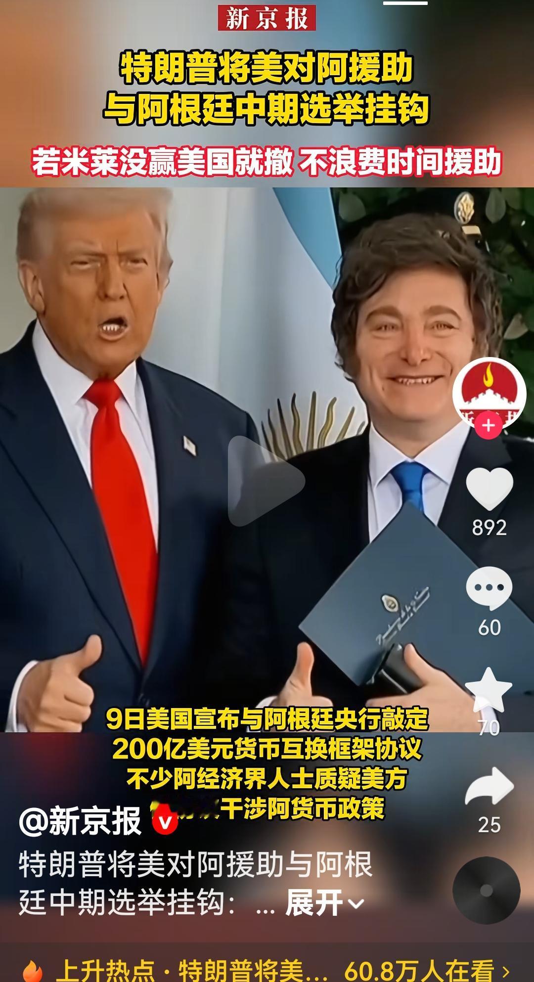 特朗普说如果米莱没有赢得阿根廷中期选举美国将不在援助阿根廷 根据媒体报道,10月14日美国总统特朗普说如果米莱没有赢得阿根廷中期选举,美国将不会在浪费时间援助阿根廷 阿根廷将在10月26日举行国会中期选举 改选众议院半数席位,和参议院三分之一席位 最近一段时间米莱支持率下滑,为了争取更多支持,米莱和美国签订了紧急协商援助计划 10月9号美国和阿根廷央行签订了200亿美元货币互换,但是阿根廷有关人士说这是借着协议干涉阿根廷货币政策 米莱和特朗普走在一起就是一个炸弹,两个都是没底线,不择手段的人,搞在一起就是火药桶中国管控稀土出口对全球稀土市场有何影响 为什么国人拿诺贝尔奖的人很少 图片来自新京报视频