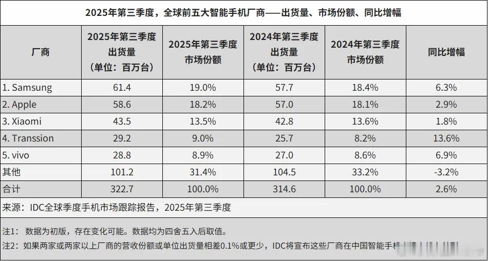 Canalys和IDC发布了2025年第三季度全球智能手机市场出货份额报告。