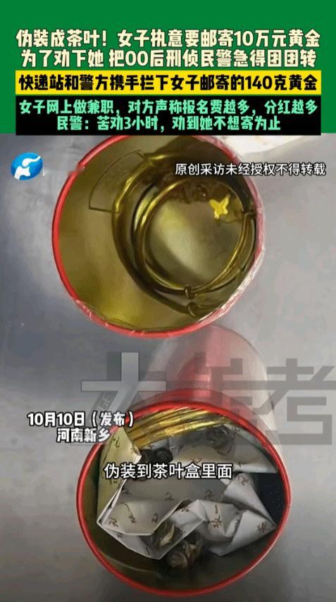 10月10日报道,河南新乡,女子拿着一桶茶叶来找快递小哥来寄件,小哥打开一查验,竟然发现茶叶桶里藏着三个明晃晃的金手镯,足有140多克,价值十多万元。小哥察觉到不对劲,立马报警。面对民警询问,女子情绪抵触,一口咬定自己自愿,不让他们管。在民警的耐心开导下,女子终于说出了原因,真相让人后背发凉。 10月10日大参考报道,河南新乡一家快递点,一位中年女子抱着个茶叶桶走进来,说要寄快递,快递员小王按照规定要开箱验货,手伸进去的瞬间就感觉不对,里面根本不是茶叶,而是硬邦邦的金属。 拿出来一看三个金手镯在灯光下闪闪发光,足足140多克,按现在的金价算,这可是十几万的巨款,小王心里咯噔一下这事儿不简单。 正常人谁会用茶叶桶装金手镯寄快递,小王立刻找借口稳住女子,悄悄拨通了110。 警察很快赶到现场,可女子的反应让所有人都意外,她不但不配合,反而情绪激动地指责快递员和警察多管闲事:这是我的东西,我想怎么寄就怎么寄,关你们什么事。 经验丰富的民警一看这架势就明白了,又是一个被骗子洗脑的受害者,这种情况他们见多了,受害者往往比骗子还要坚定,认为所有阻止他们的人都是坏人。 民警把女子带到旁边的办公室,开始了漫长的劝说工作,女子姓张,起初她什么都不愿意说,只是反复强调:你们不懂马上就能翻倍了,耽误了我的事你们负责吗。 在民警的耐心引导下,张女士终于松口了,原来她最近手头紧,想找个兼职补贴家用,某天刷手机时一条日赚500,在家就能做的广告吸引了她的注意。 抱着试试看的心态,她加了对方的联系方式,对方自称是某投资平台的金牌导师,专门带新人赚钱,刚开始张女士只投了200块试水,没想到第二天账户里就显示赚了50块,而且真的能提现到账。 这下张女士彻底相信了,在导师的鼓动下,她的投入越来越大500、1000、5000……看着账户里的数字不断增长,她仿佛看到了财富自由的曙光。 可当她投入了所有积蓄,准备提现享受胜利果实时,系统突然显示账户异常,无法提现,张女士慌了赶紧联系导师。 导师安慰她说这是正常现象,只要再充值一笔激活金,不仅能解冻账户,还能获得平台的特别奖励,收益直接翻三倍,可张女士已经没钱了,导师就出主意:黄金也可以我们平台都认。 于是就有了开头的一幕,张女士翻出压箱底的三个金手镯,准备孤注一掷。 民警拿出手机给张女士看了一个又一个类似的案例:您看,这是上个月郑州的被骗了20万,这是前天开封的,老两口的养老钱全没了。 看着新闻里那些痛哭流涕的受害者,张女士的表情开始变化,民警趁热打铁:您想想,如果他们真能让您赚钱,为什么还要您的金手镯,如果账户真的只是冻结,为什么不能从里面扣钱,非要您再寄钱过去? 这些问题像针一样扎在张女士心上,她开始回想整个过程,越想越觉得不对劲,为什么导师总是在她想收手的时候给她画大饼,为什么每次都是差一点就能提现。 三个小时的劝说后,张女士终于清醒了,她瘫坐在椅子上,眼泪止不住地流:我怎么这么傻,差点把家底都搭进去了。 警察调查发现这是一个典型的杀猪盘诈骗,骗子先用小利诱惑,等受害者上钩后,再编造各种理由让其不断加大投入,最后卷款消失。 这种骗局之所以屡屡得手,就是抓住了人们急于赚钱的心理,先给点甜头建立信任,再利用沉没成本让人不甘心放弃,最后在受害者最脆弱的时候给出最后一搏的机会。 幸运的是这次有负责任的快递员和民警及时出手,才避免了悲剧的发生,但更多的受害者可能就没这么幸运了。 网络时代骗局无处不在,记住一句话:天上不会掉馅饼,所有让您先交钱的赚钱机会,都要打个大大的问号,踏踏实实工作,才是最靠谱的致富之路。 麻烦看官老爷们右上角点击一下“关注”,既方便您进行讨论和分享,又能给您带来不一样的参与感,感谢您的支持!