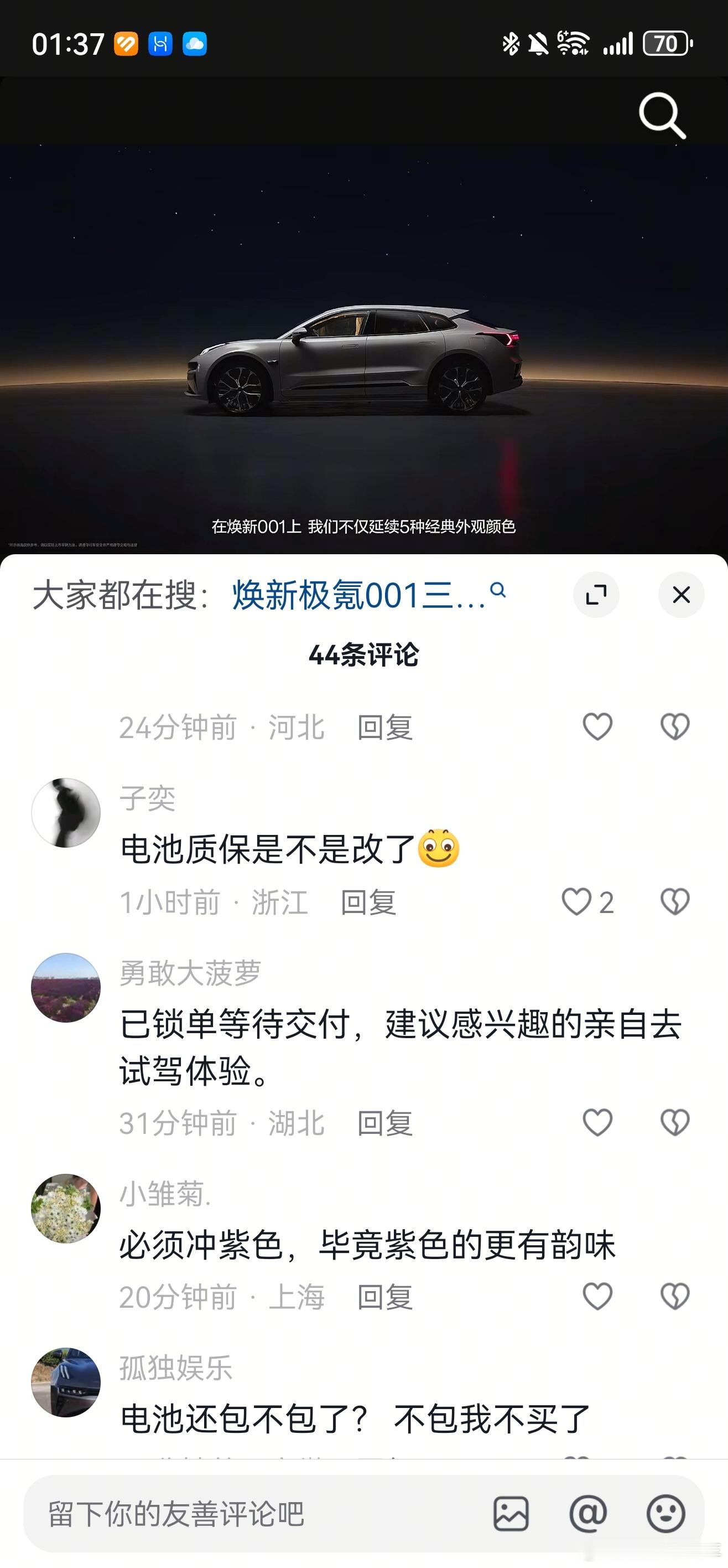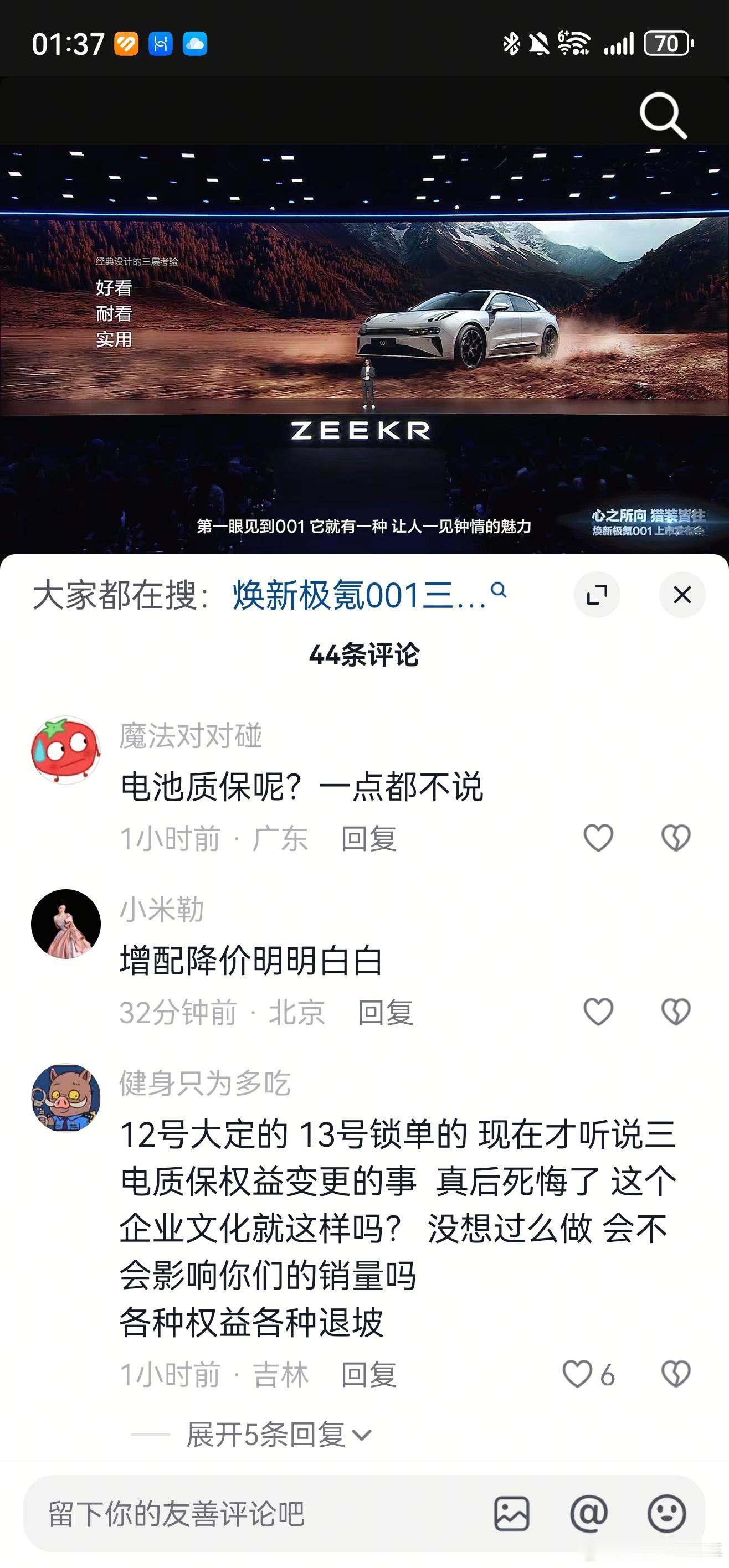 极氪官方抖音号下面全是对电池质保问题和激光雷达问题的评论
