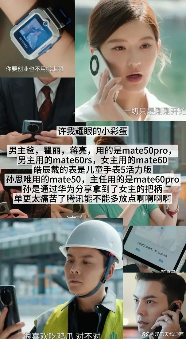 《许我耀眼》全剧都植入了华为的广告,剧里出现的手机,笔记本电脑,儿童电话手表都是华为,女配孙是通过华为分享拿到了女主许妍的把柄也给了近景特写画面,包括剧里许妍和沈皓明多处高能出圈名场面都给了华为的近景特写画面[并不简单]