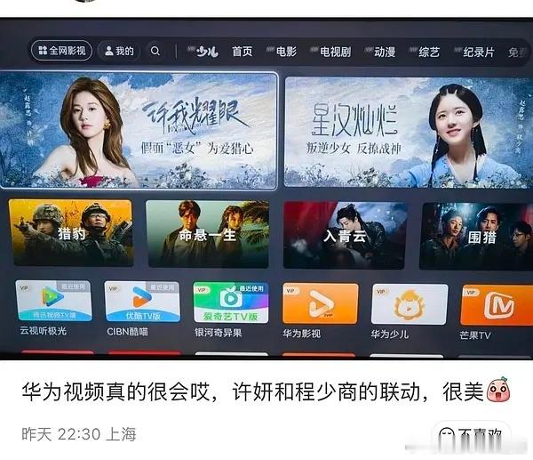 现在《许我耀眼》大爆,品牌方很满意, 华为视频排面给足,许妍➕程少商联动[666][666][666]